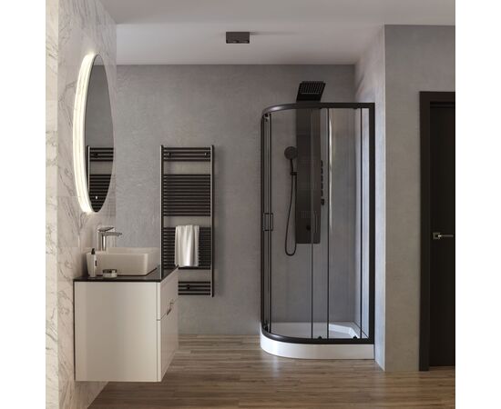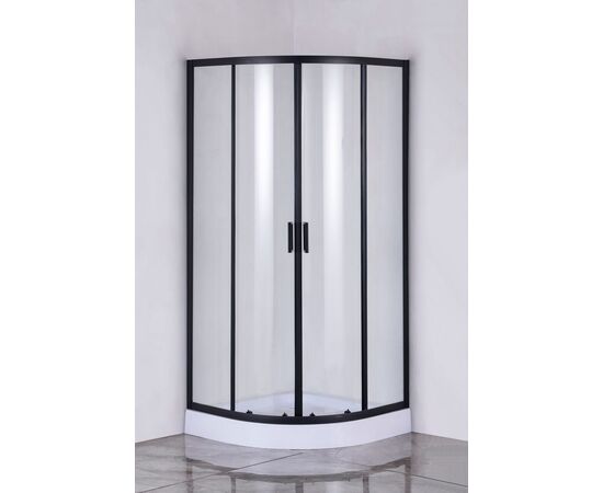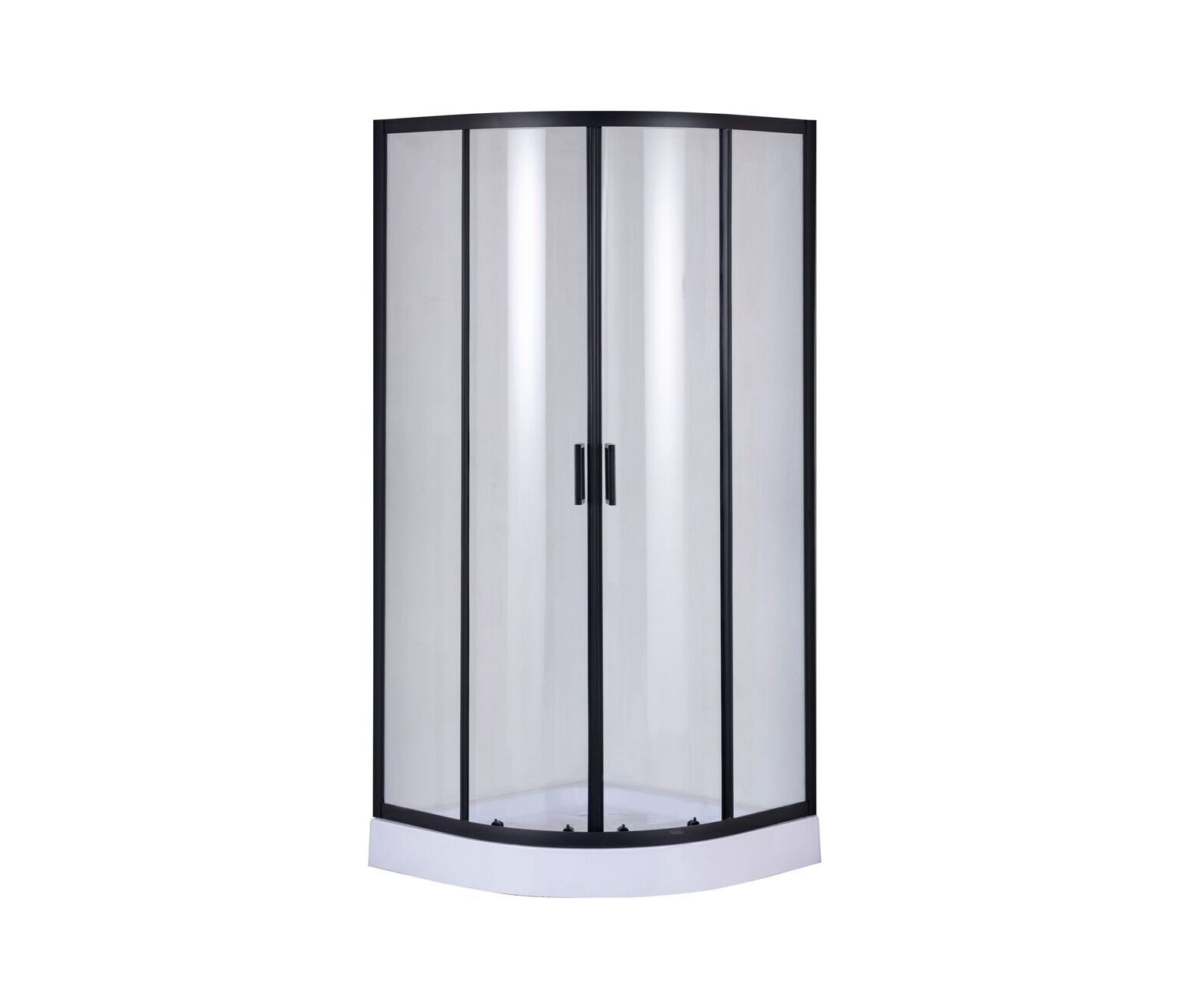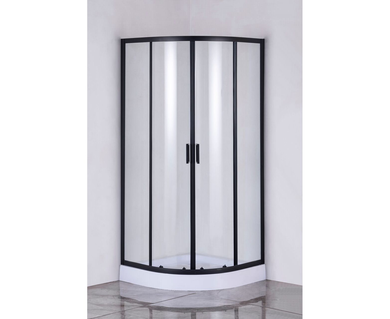 Форма: четверть круга. Количество секций двери: 2. Конструкция дверей: раздвижные. Верхние ролики: двойные. Нижние ролики: двойные с кнопкой. Ширина входа, см: 49. Цвет профиля: матовый черный. Материал профиля: алюминий. Материал стенок и дверей: закаленное стекло. Толщина стекла, мм: 6. Декор стекол: прозрачное. Тип монтажа: на пол или поддон.
