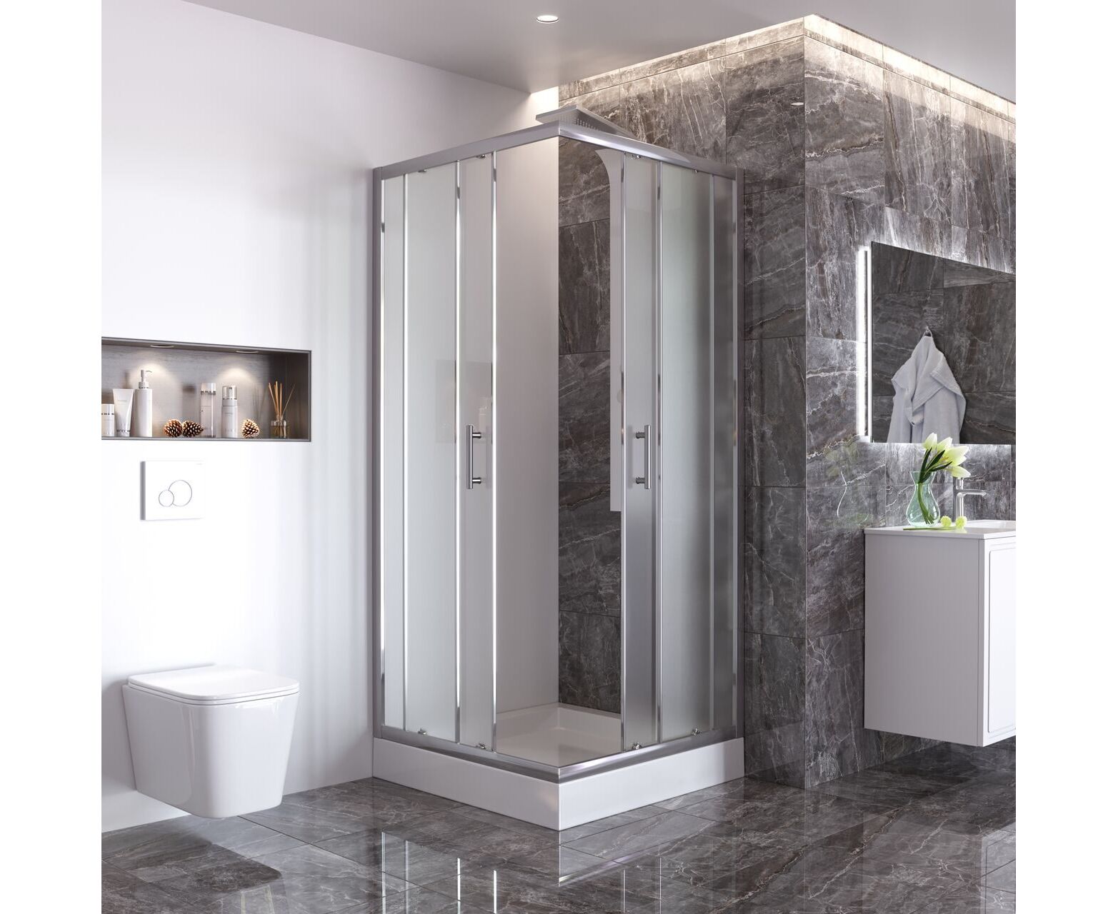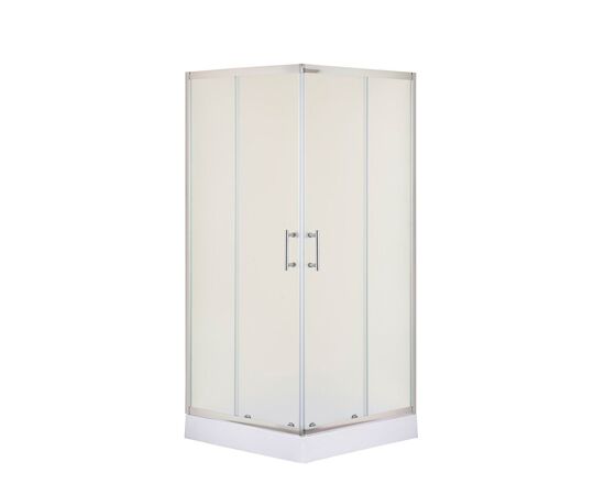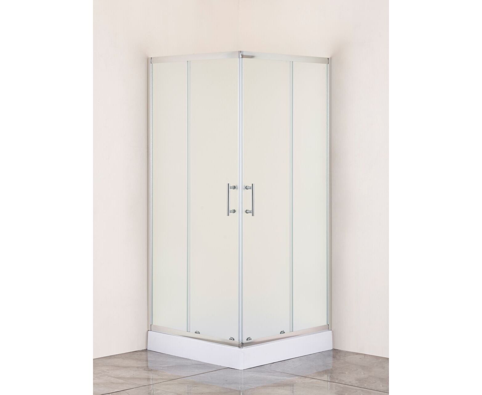 Форма: квадрат. Количество секций двери: 2. Конструкция дверей: раздвижные. Верхние ролики: двойные. Нижние ролики: двойные с кнопкой. Ширина входа, см: 49. Цвет профиля: хром. Материал профиля: алюминий. Материал стенок и дверей: закаленное стекло. Толщина стекла, мм: 6. Декор стекол: рифленое. Тип монтажа: на пол или поддон.