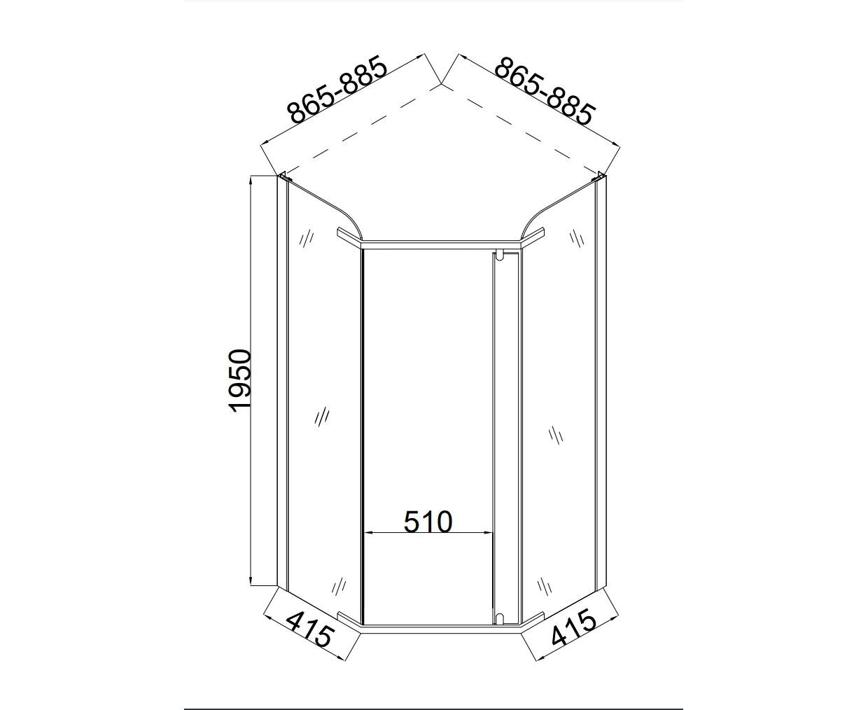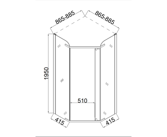Форма: пятиугольник. Количество секций двери: 1. Конструкция дверей: распашные. Верхние ролики: . Нижние ролики: . Ширина входа, см: 51. Цвет профиля: хром. Материал профиля: алюминий. Материал стенок и дверей: закаленное стекло. Толщина стекла, мм: 6. Декор стекол: прозрачное. Тип монтажа: на пол или поддон.