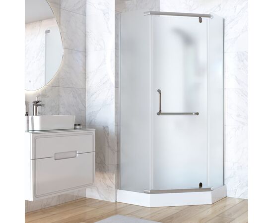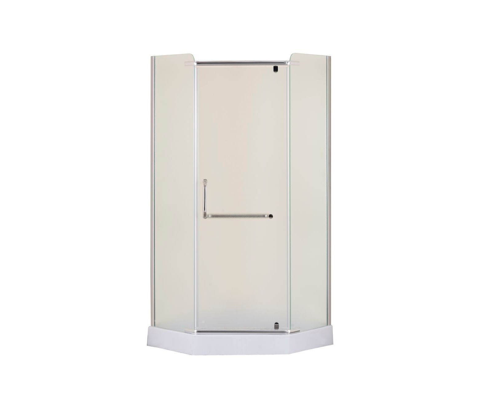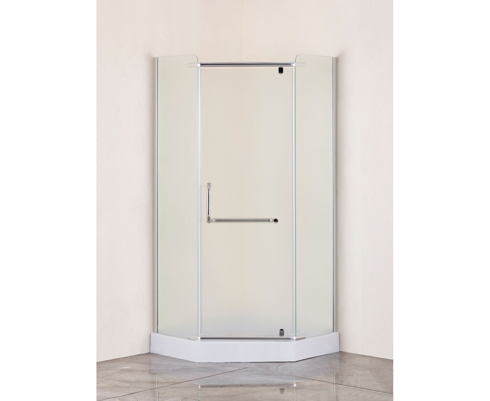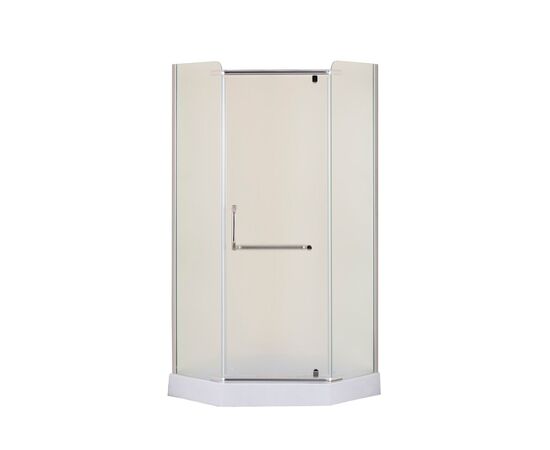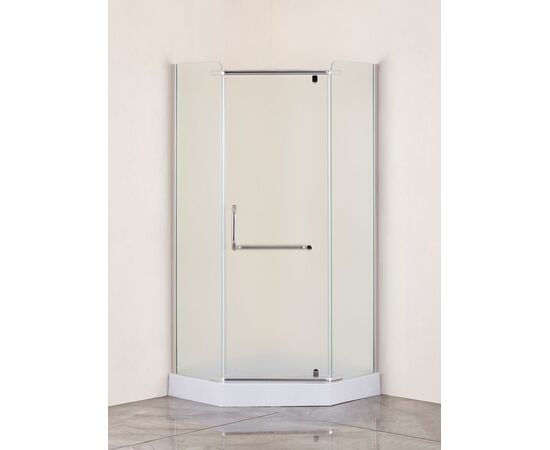 Форма: пятиугольник. Количество секций двери: 1. Конструкция дверей: распашные. Верхние ролики: . Нижние ролики: . Ширина входа, см: 51. Цвет профиля: хром. Материал профиля: алюминий. Материал стенок и дверей: закаленное стекло. Толщина стекла, мм: 6. Декор стекол: рифленое. Тип монтажа: на пол или поддон.