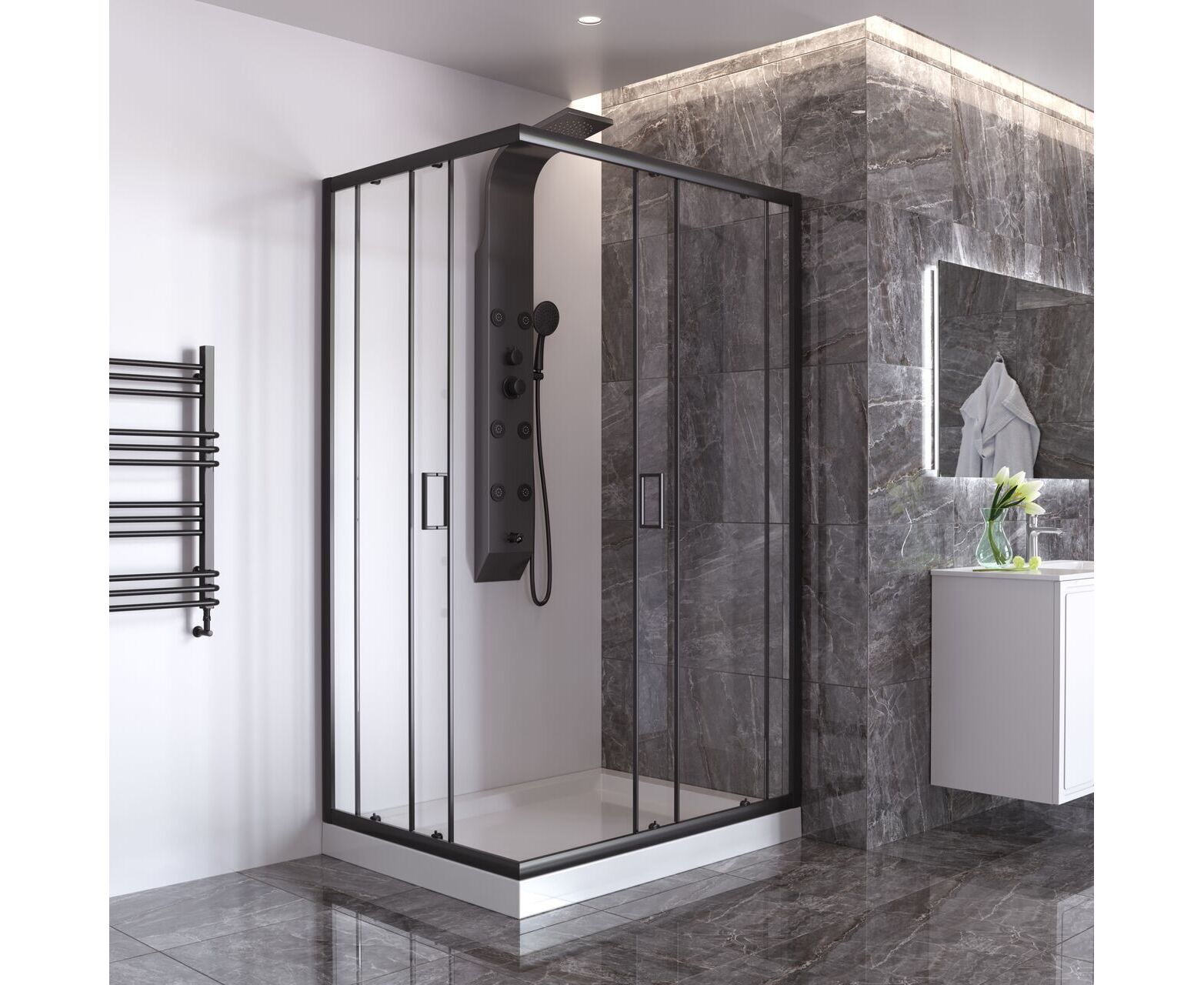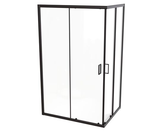 Форма: прямоугольник. Количество секций двери: 2. Конструкция дверей: раздвижные. Верхние ролики: двойные. Нижние ролики: двойные с кнопкой. Ширина входа, см: 61. Цвет профиля: матовый черный. Материал профиля: алюминий. Материал стенок и дверей: закаленное стекло. Толщина стекла, мм: 6. Декор стекол: прозрачное. Тип монтажа: на пол или поддон.