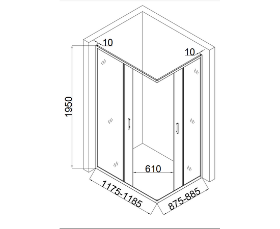 Форма: прямоугольник. Количество секций двери: 2. Конструкция дверей: раздвижные. Верхние ролики: двойные. Нижние ролики: двойные с кнопкой. Ширина входа, см: 61. Цвет профиля: хром. Материал профиля: алюминий. Материал стенок и дверей: закаленное стекло. Толщина стекла, мм: 6. Декор стекол: прозрачное. Тип монтажа: на пол или поддон.