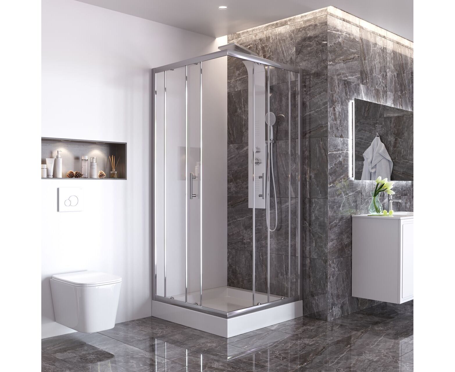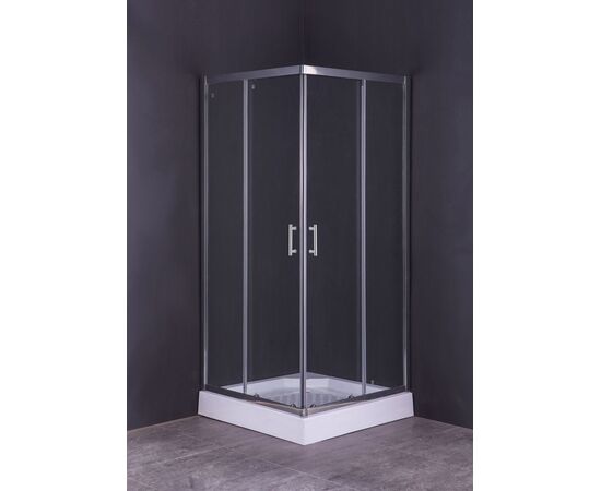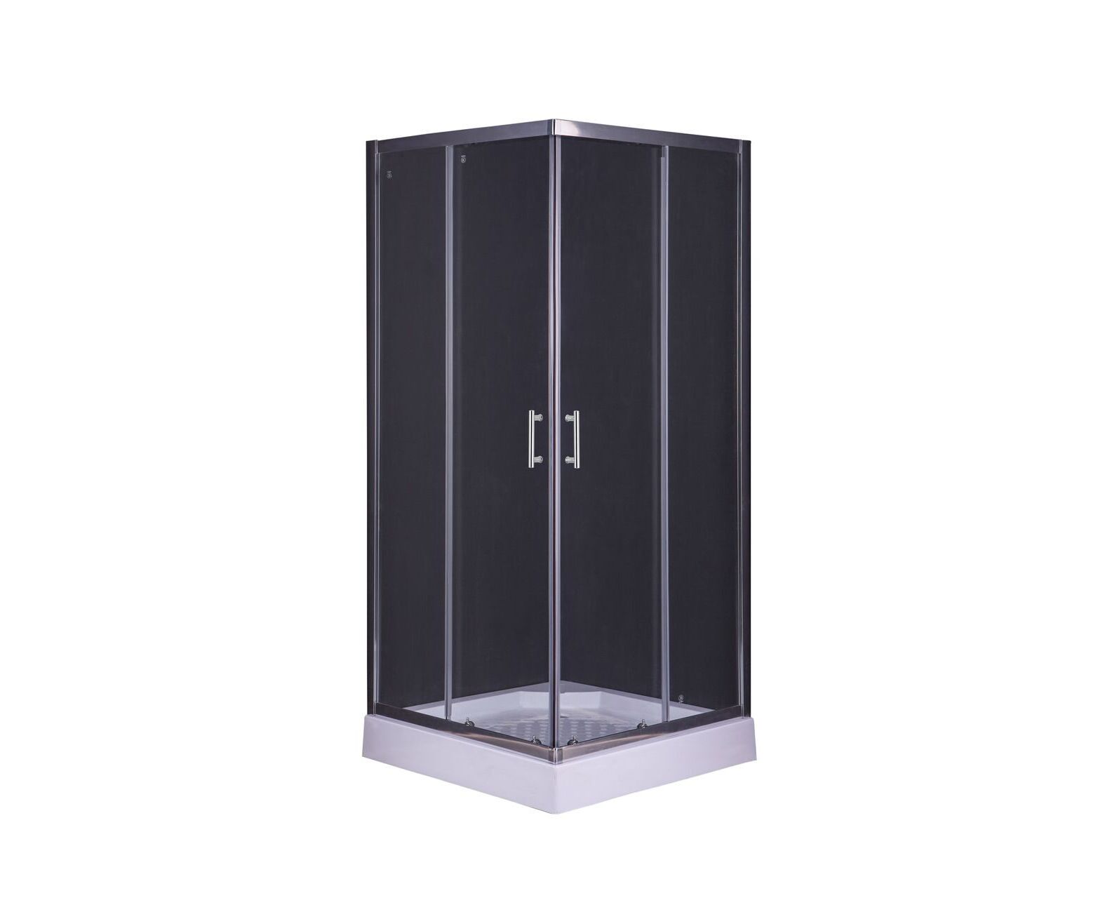Форма: квадрат. Количество секций двери: 2. Конструкция дверей: раздвижные. Верхние ролики: двойные. Нижние ролики: двойные с кнопкой. Ширина входа, см: 53. Цвет профиля: хром. Материал профиля: алюминий. Материал стенок и дверей: закаленное стекло. Толщина стекла, мм: 6. Декор стекол: прозрачное. Тип монтажа: на пол или поддон.