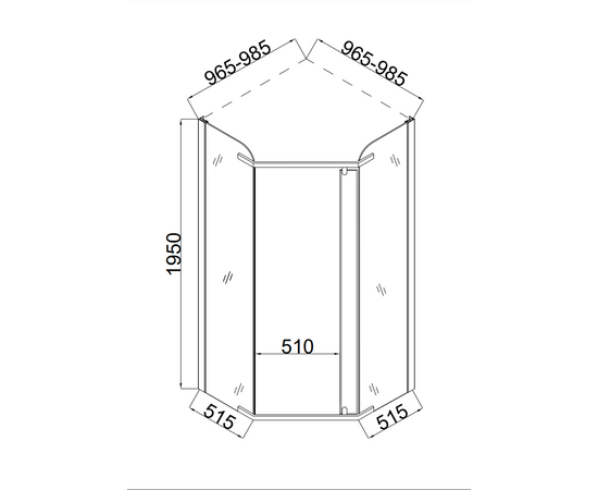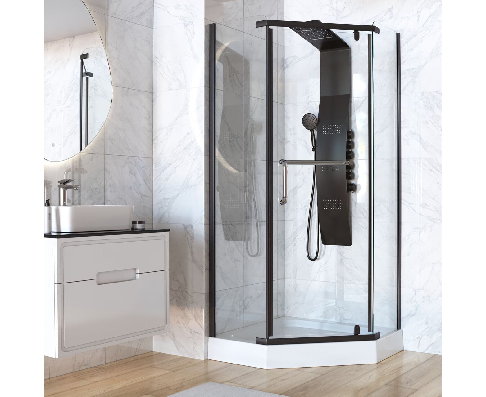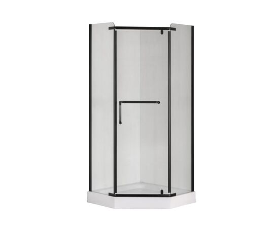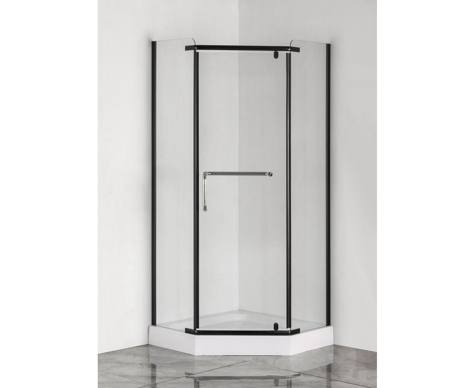 Форма: пятиугольник. Количество секций двери: 1. Конструкция дверей: распашные. Верхние ролики: . Нижние ролики: . Ширина входа, см: 51. Цвет профиля: матовый черный. Материал профиля: алюминий. Материал стенок и дверей: закаленное стекло. Толщина стекла, мм: 6. Декор стекол: прозрачное. Тип монтажа: на пол или поддон.
