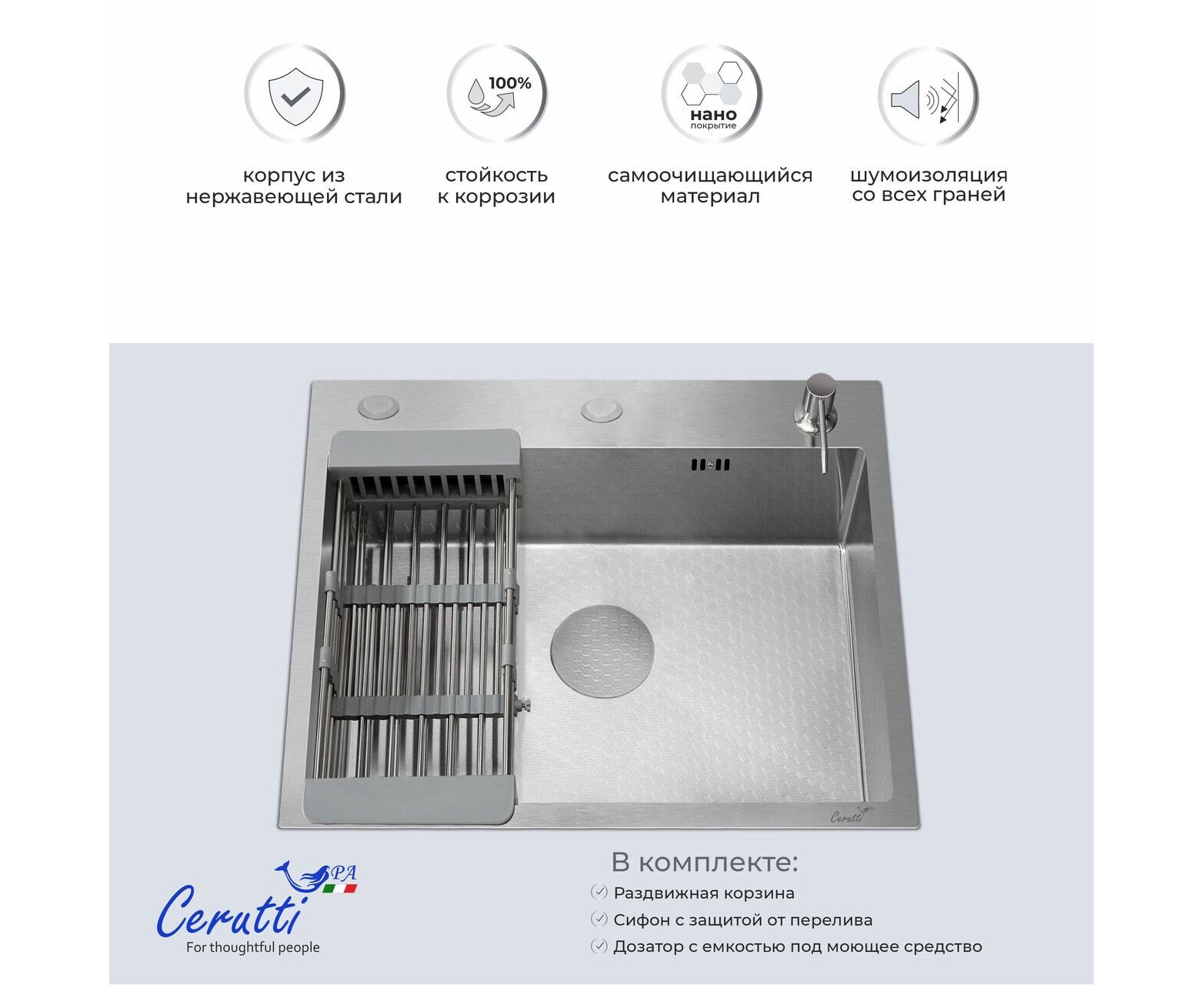 Кухонная мойка Ceruttispa GLORIA50 nano embos (матовый хром) – это не просто элемент кухни, это инвестиция в ваш комфорт, стиль и долговечность.