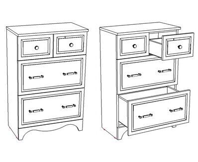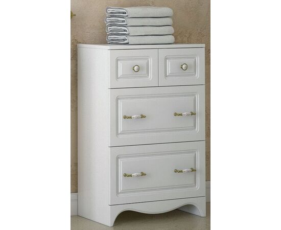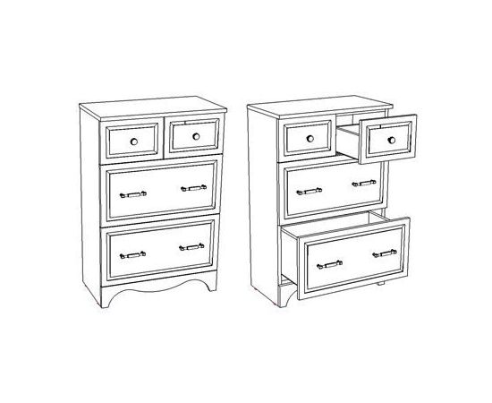 У комода 2 больших ящика снизу и 2 маленьких ящика сверху. Фасады имеют фрезеровку.