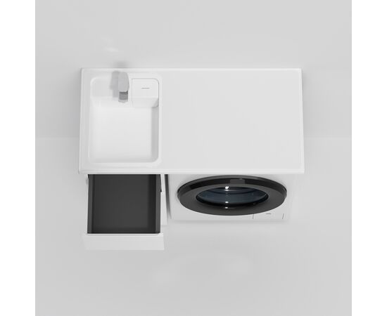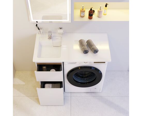 Дизайнерская раковина из литьевого мрамора белоснежного цвета с бортиком скрытым сливом и съемной мыльницей. Раковина оснащена просторной столешницей на которой можно разместить косметические и гигиенические средства. Столешница защищает стиральную машину от повреждений и механических воздействий.