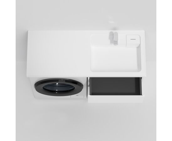 Дизайнерская раковина из литьевого мрамора белоснежного цвета с бортиком скрытым сливом и съемной мыльницей. Раковина оснащена просторной столешницей на которой можно разместить косметические и гигиенические средства. Столешница защищает стиральную машину от повреждений и механических воздействий.