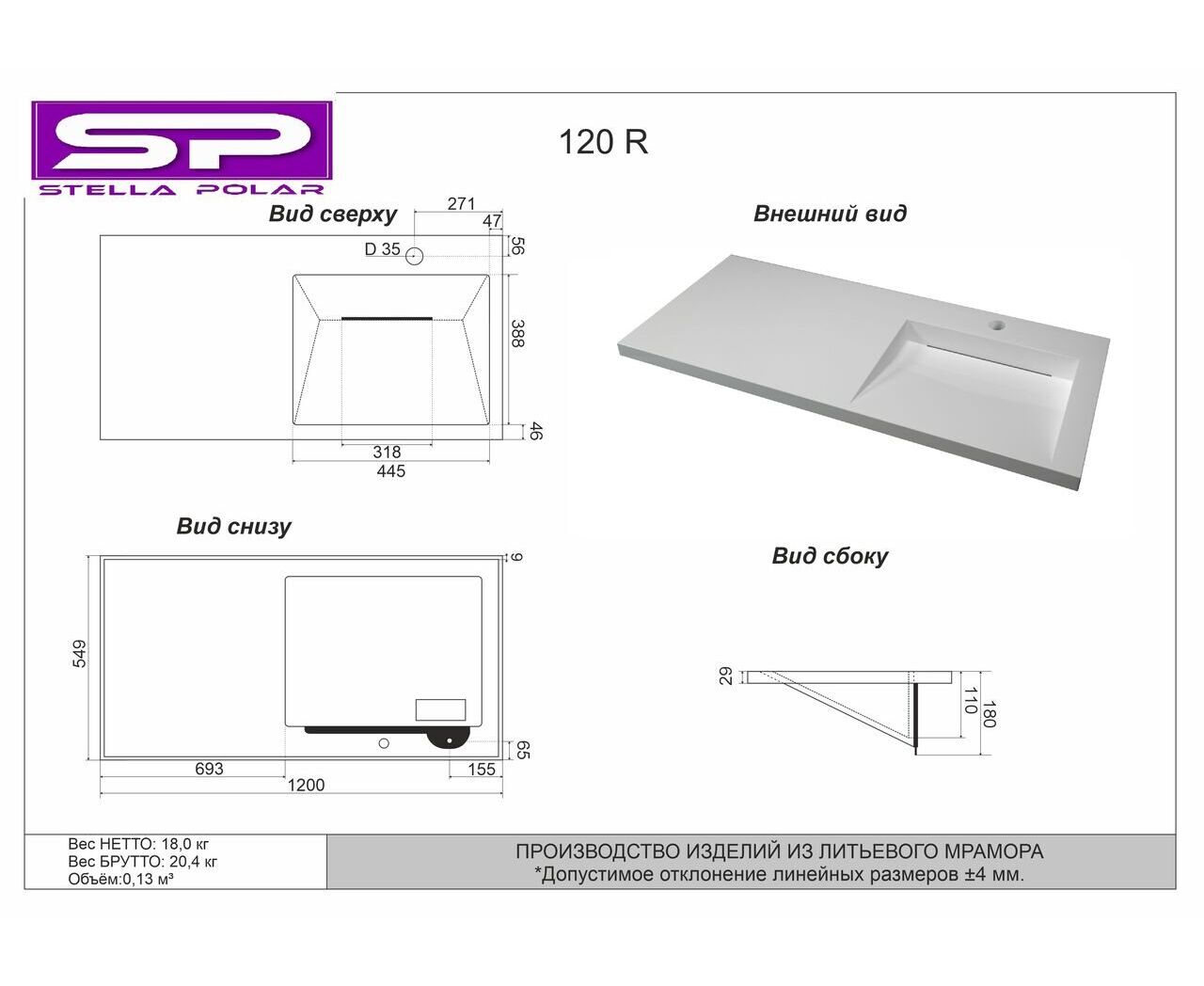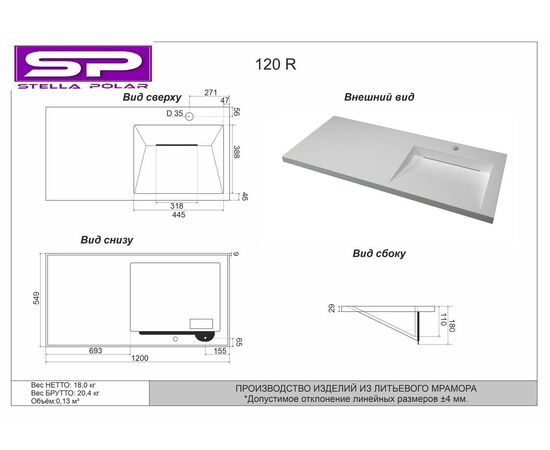 БрендStella Polar Ширина, см120 Глубина, см54 Высота, см18 Материал раковиныИскусственный мрамор СтранаРоссия Гарантия2 года