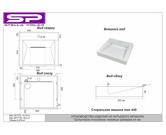 БрендStella Polar Ширина, см60 Глубина, см60 Высота, см10.5 Материал раковиныИскусственный мрамор СтранаРоссия Гарантия2 года