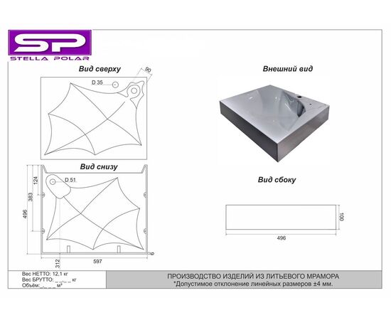 БрендStella Polar Ширина, см59.7 Глубина, см49.6 Высота, см10 Материал раковиныИскусственный мрамор СтранаРоссия Гарантия2 года
