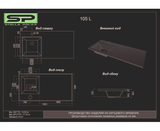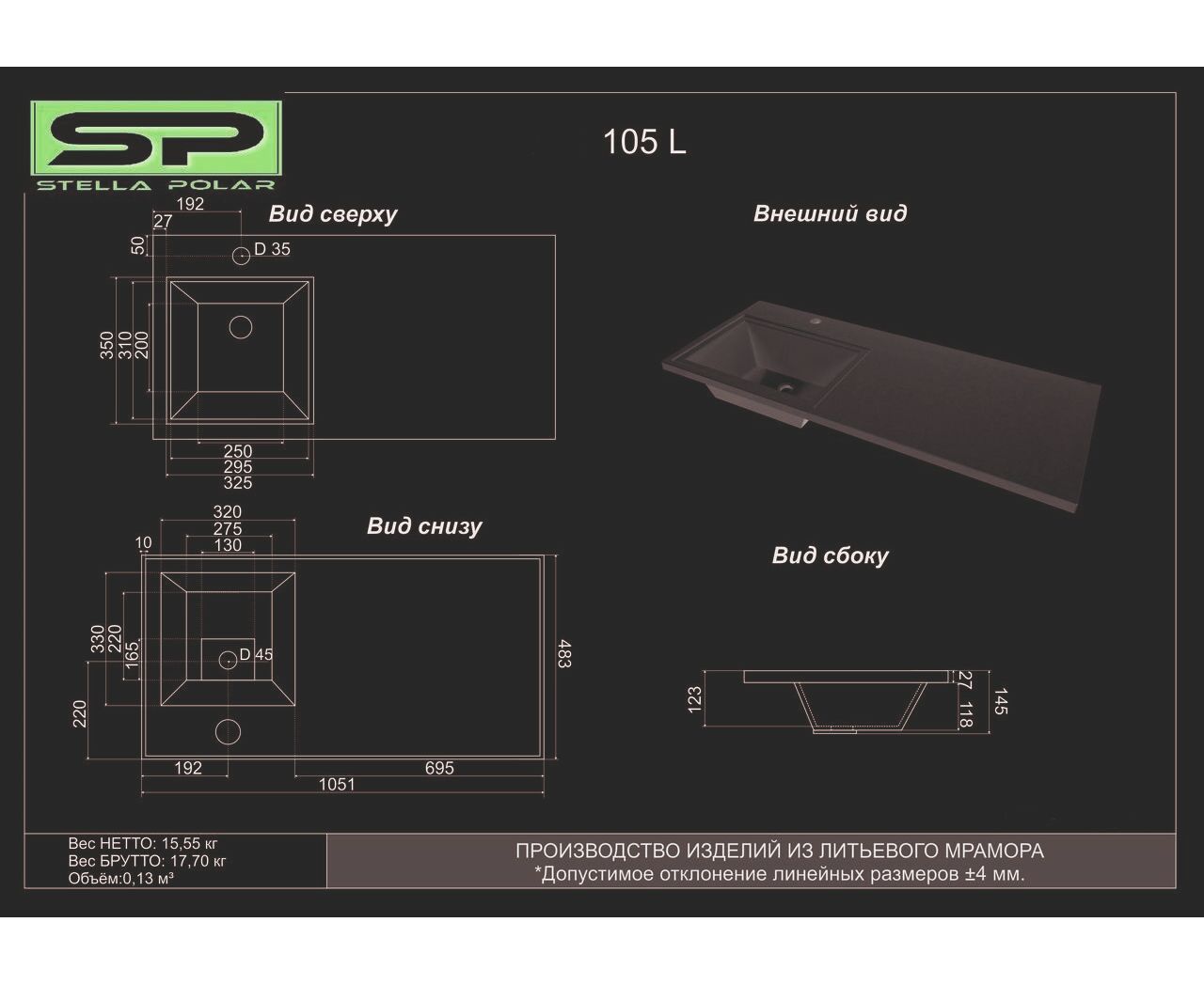 БрендStella Polar Ширина, см105.3 Глубина, см48.5 Высота, см14.3 Материал раковиныИскусственный мрамор СтранаРоссия Гарантия2 года
