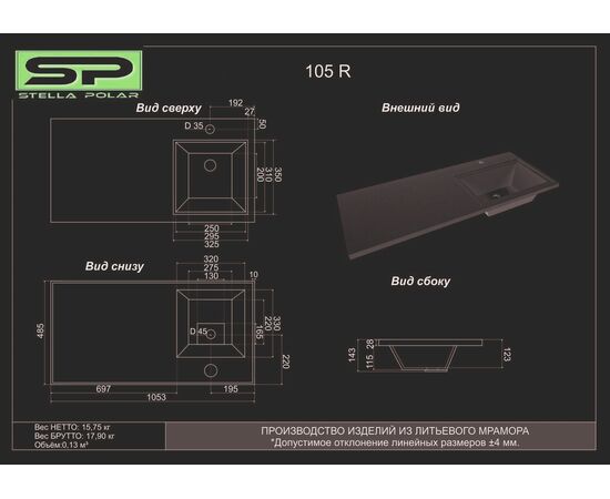 БрендStella Polar Ширина, см105.3 Глубина, см48.5 Высота, см14.3 Материал раковиныИскусственный мрамор СтранаРоссия Гарантия2 года