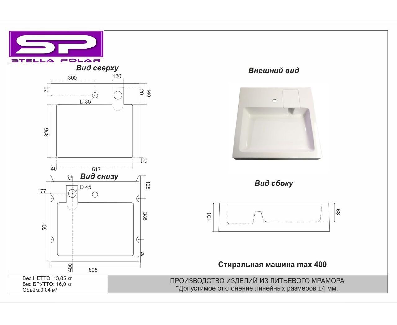 БрендStella Polar Ширина, см59.9 Глубина, см50.1 Высота, см10 Материал раковиныИскусственный мрамор СтранаРоссия Гарантия2 года