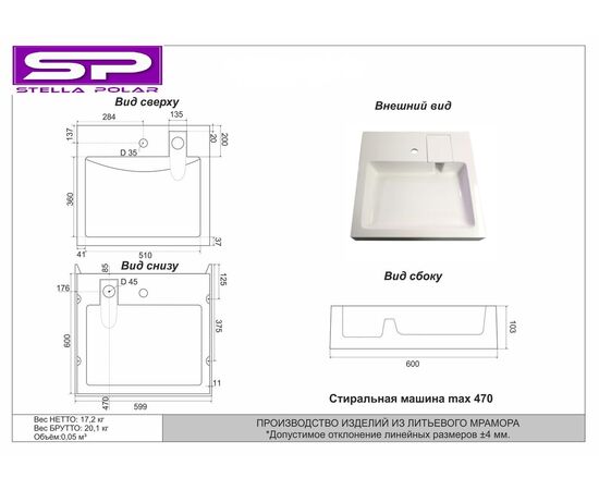 Характеристики Раковина над стиральной машиной Stella Polar Солярис 60х60 белый мрамор