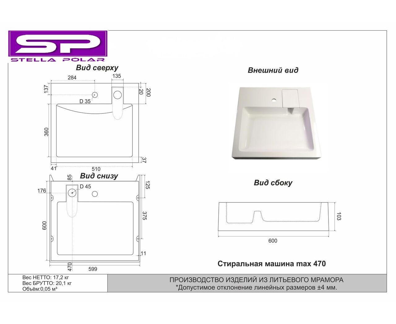 Характеристики Раковина над стиральной машиной Stella Polar Солярис 60х60 черный мрамор