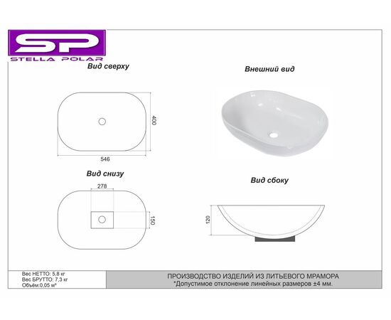 БрендStella Polar Ширина, см54.6 Глубина, см40 Высота, см12 Материал раковиныИскусственный мрамор СтранаРоссия Гарантия2 года