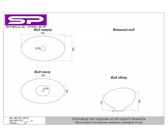 Характеристики Раковина накладная Stella Polar Орион Люкс stone