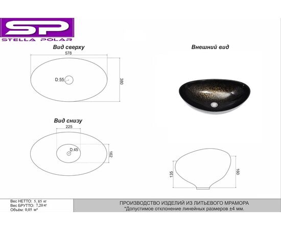Характеристики Раковина накладная Stella Polar Орион золотой вулкан