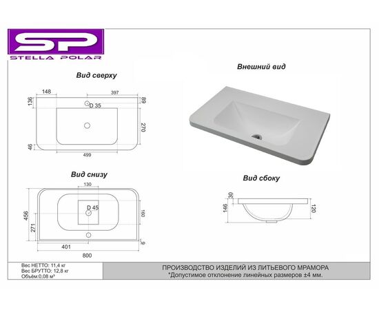 БрендStella Polar Ширина, см80 Глубина, см45.6 Высота, см12 Материал раковиныИскусственный мрамор СтранаРоссия Гарантия2 года