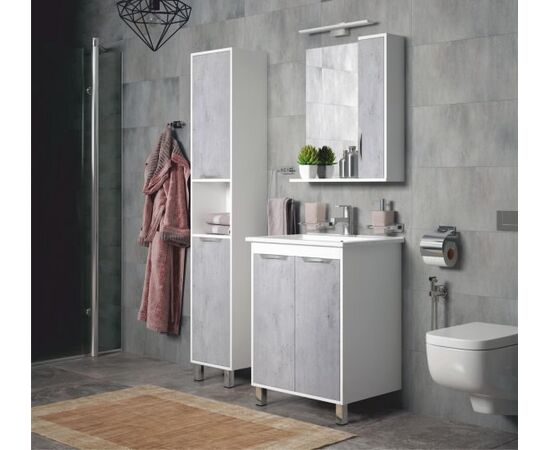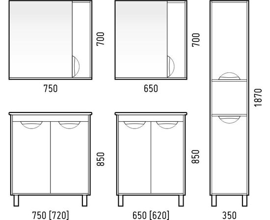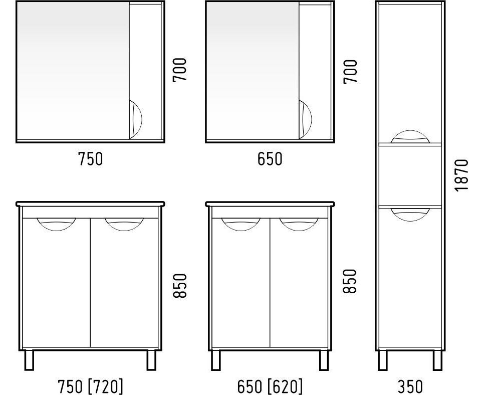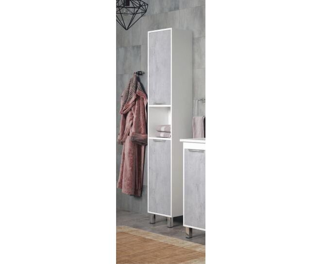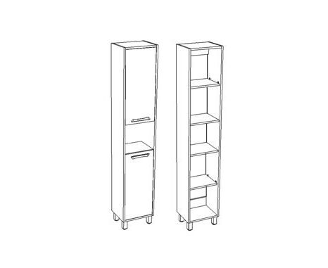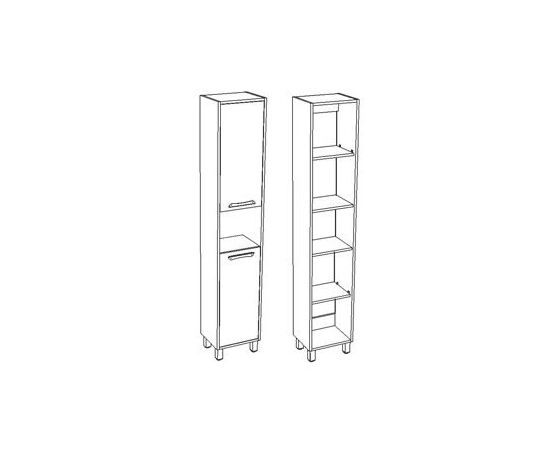 У пенала 2 распашные двери, по центру - ниша. У пенала - 4 металлические опоры. Боковины и переднии кромки видимых полок красятся в белую глянцевую эмаль.