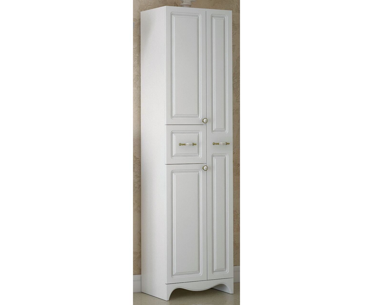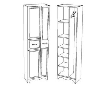 В левой части у пенала есть 2 распашные двери: наверху и внизу. Между ними располагается выдвижной ящик. Справа - единая большая дверь, за которой расположено место под халаты. В верхней части - 2 крючка. Все фасады имеют фрезеровку.