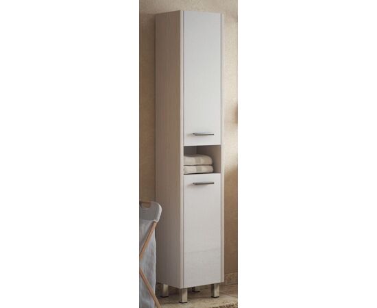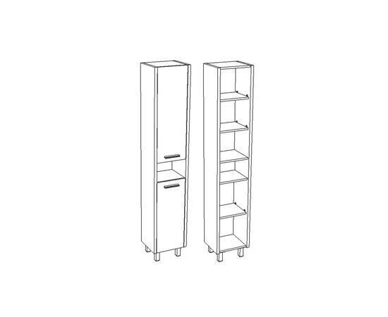 У пенала 2 распашные двери, позади вкладные полки. Боковины выполнены из ЛДСП 26 мм толщиной. У пенала 4 металлические опоры.