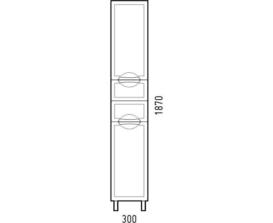 У пенала "Монро 30 Z2" 2 распашные двери, позади - вкладные полки. По центру 2 выдвижных ящика. Высота ящиков 110 мм. Все двери на петлях с доводчиками. Пенал является универсальным - то есть может быть как правого, так и левого открывания. У пенала 4 металлические опоры. Фасады - плёнка ПВХ белая.