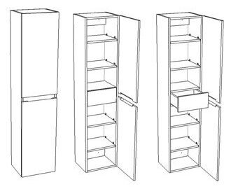 У пенала 2 двери, за каждой - по две вкладные полки, с возможностью регулировки по высоте. Петли на дверях с доводчиками. Фасады без ручек - есть специально сделанная фрезеровка для открывания. По центру расположен выдвижной ящик, фасад ящика так же имеет специальную фрезеровку для открывания. Высота ящика 100 мм. Шкаф-пенал является универсальным, то есть перевернув его, можно расположить двери справа или слева. Крепление к стене осуществляется при помощи дюбель-пробок через царги вверху пенала. Фасадная часть и боковины - в эмали.
