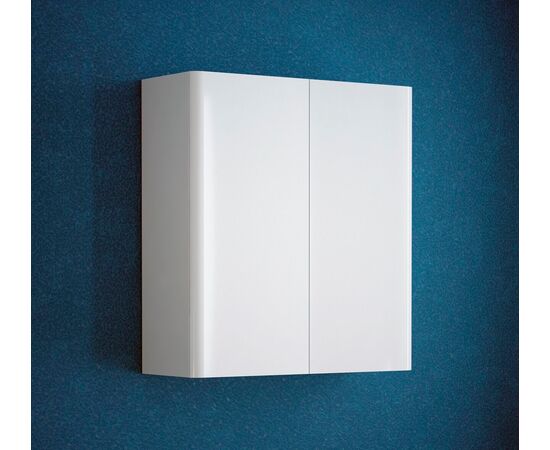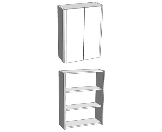 Подвесной шкаф имеет интересный эргономичный дизайн - скругление боковин плавно переходит в скругления на фасадах. У шкафа 2 распашные двери, позади - 2 вкладные полки. Все двери имеют вкладные петли с доводчиками Firmax. Ручек нет, конструктив шкафа позволяет открывать двери без использования ручек. Присутствуют подвесы для крепления на стене.