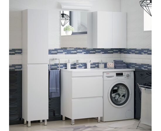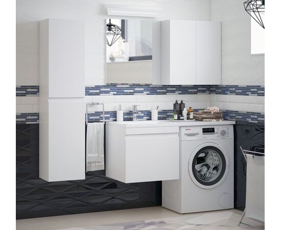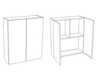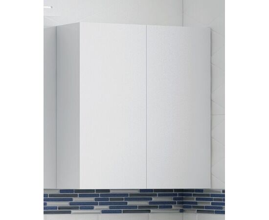 У шкафа 2 фасада. Петли на фасадах с доводчиками. Внутри шкаф разделен горизонтально пополам полкой. Верхняя часть дополнительно разделена вертикально. Фасады без ручек - есть специально сделанная фрезеровка для открывания. Фасадная часть и боковины - в эмали. В комплектацию входят установленные подвесы без дюбелей.