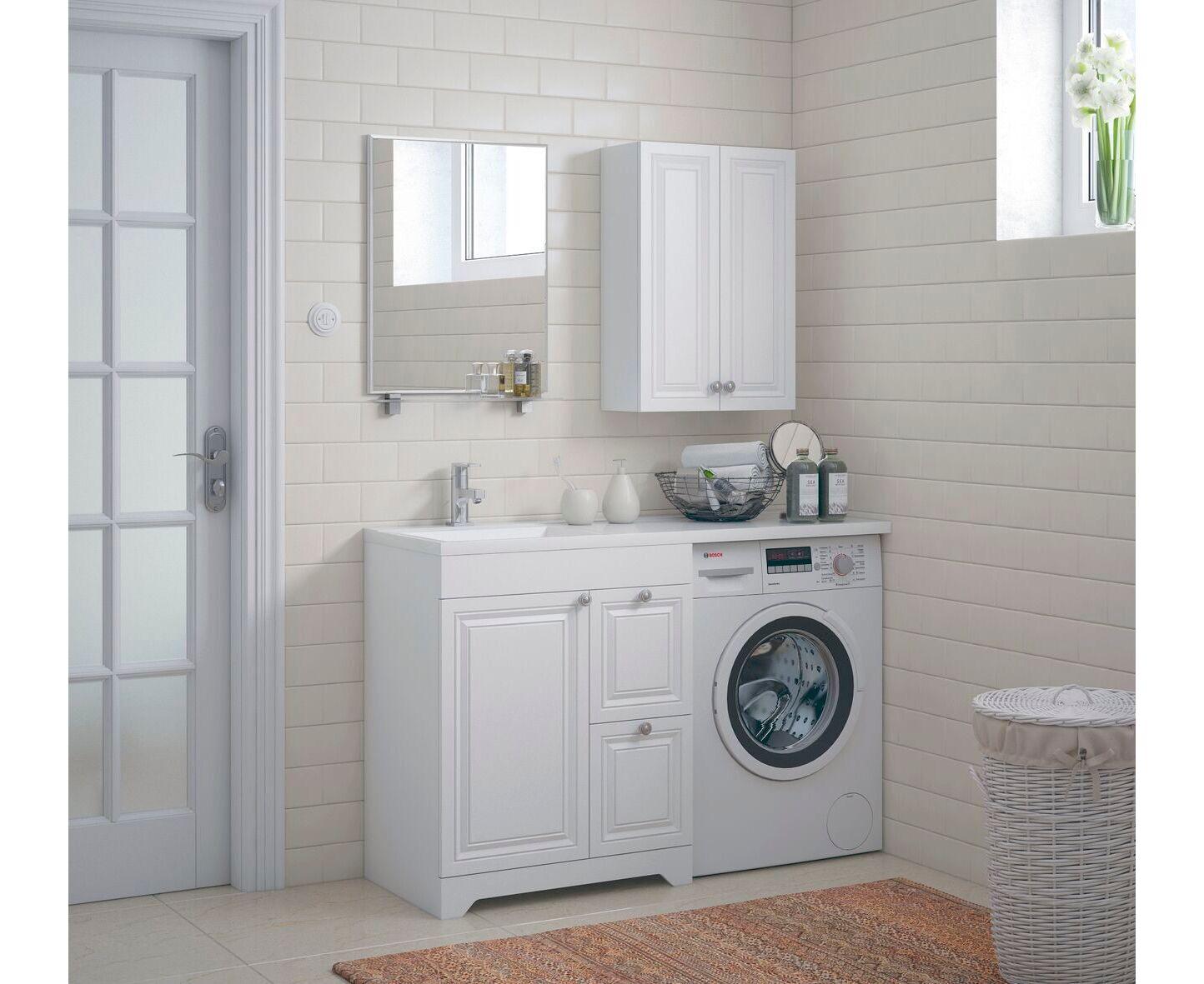 Шкаф оснащён 2 дверьми, две вкладные полки. Петли с доводчиками. Двери - МДФ в плёнке ПВХ.