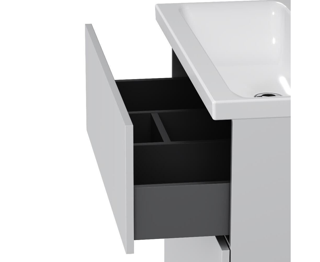 Подвесная тумба бренда AM.PM коллекции Gem идеально подойдет тем, кто предпочитает минимализм в интерьере. Современный европейский дизайн от студии DanelonMeroni (Великобритания/Италия). Фурнитура push-to-open - открытие ящика легким нажатием на фасад. Два ящика с антискользящим покрытием цвета "антрацит" – европейский стандарт.