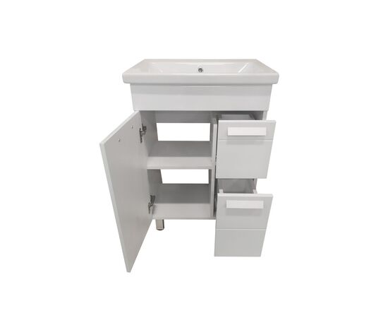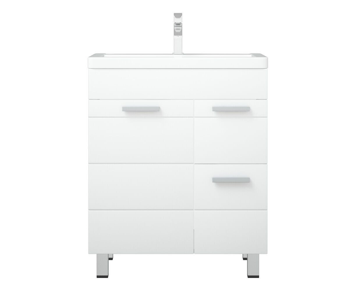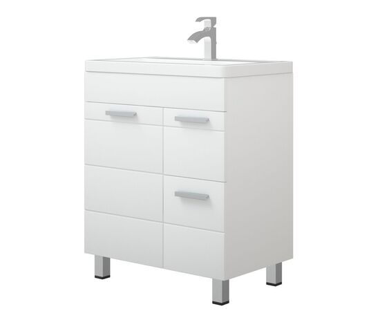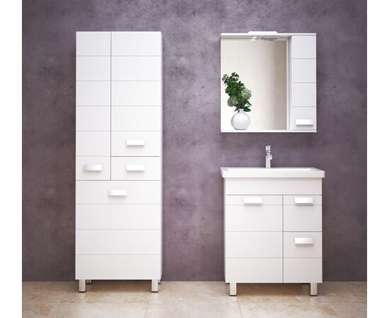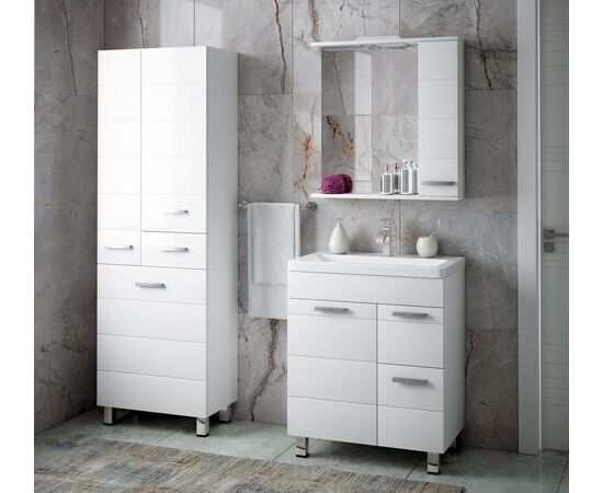 Коллекция "Денвер" - это вдохновление четкостью линий модернизма! Линейка выполнена из влагостойкого МДФ, покрытого белой глянцевой пленкой. Мебель комплектуется фурнитурой высокого качества, дверными петлями со встроенными доводчиками и удобными наклонными ручками. Линейная фрезеровка на фасадах придаст индивидуальность и задаст особый ритм Вашей ванной комнате. У тумбы слева - большая дверь, справа - 2 выдвижных ящика. Ящики на шариковых направляющих, высота ящиков - 160 и 250 мм. Петли на двери - с доводчиками. У тумбы 3 опоры. Коромысло, дверь, фасады ящиков - МДФ в плёнке белой, корпус - ЛДСП.