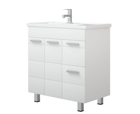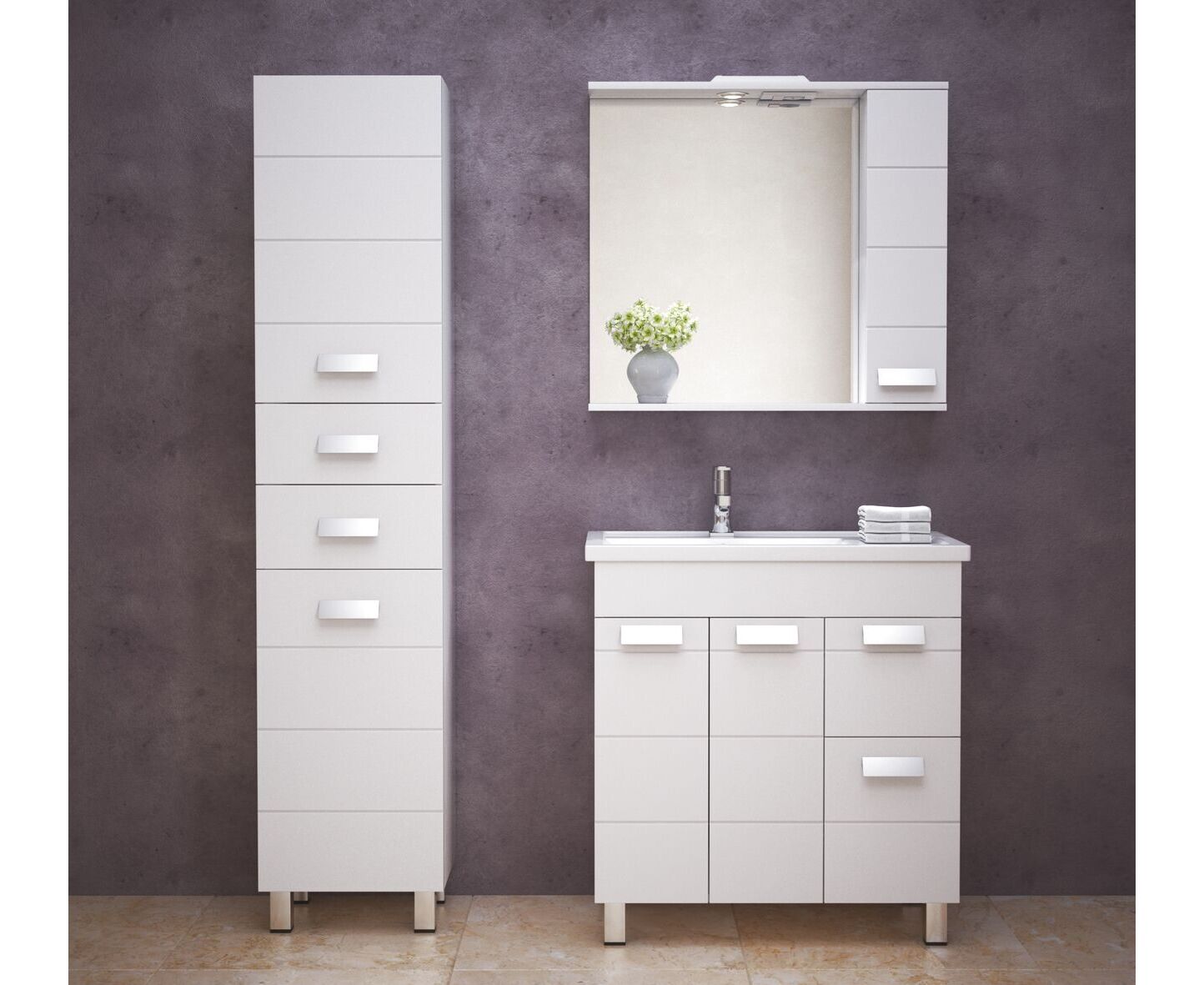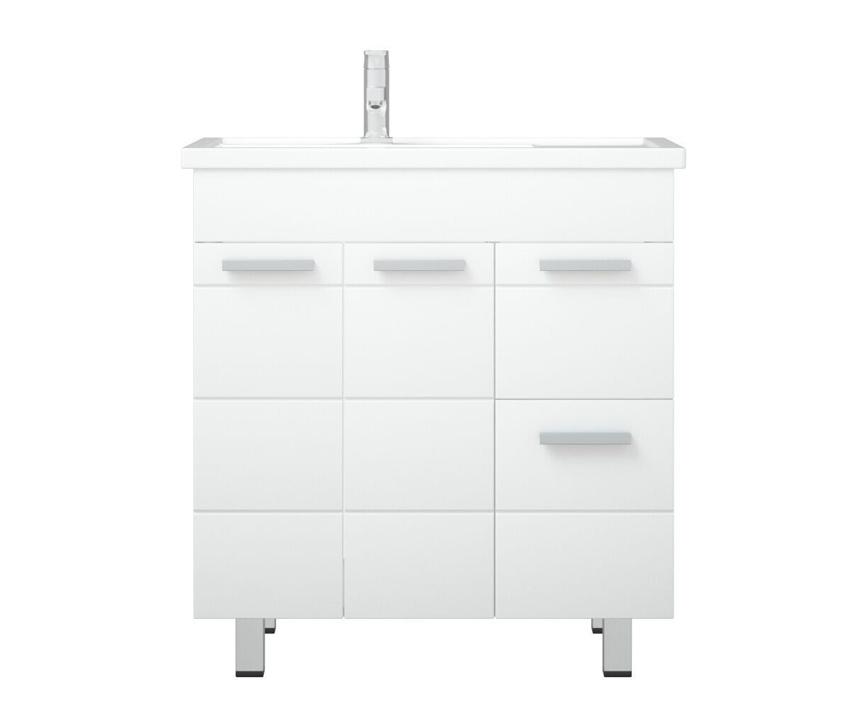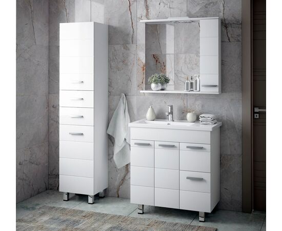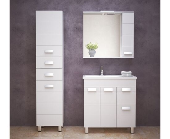 Коллекция "Денвер" - это вдохновление четкостью линий модернизма! Линейка выполнена из влагостойкого МДФ, покрытого белой глянцевой пленкой. Мебель комплектуется фурнитурой высокого качества, дверными петлями со встроенными доводчиками и удобными наклонными ручками. Линейная фрезеровка на фасадах придаст индивидуальность и задаст особый ритм Вашей ванной комнате. У тумбы слева и по центру - двери, справа - 2 выдвижных ящика. Ящики на шариковых направляющих, высота ящиков - 160 и 250 мм. Петли на двери - с доводчиками. У тумбы 3 опоры. Коромысло, двери, фасады ящиков - МДФ в плёнке белой, корпус - ЛДСП.