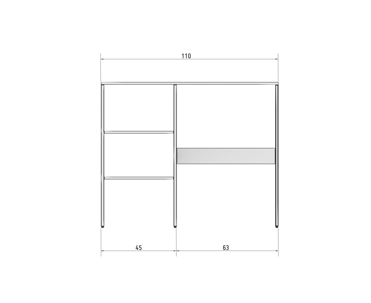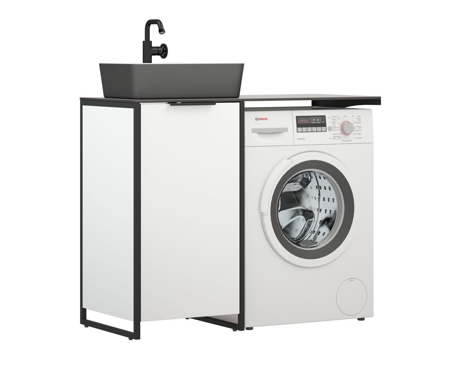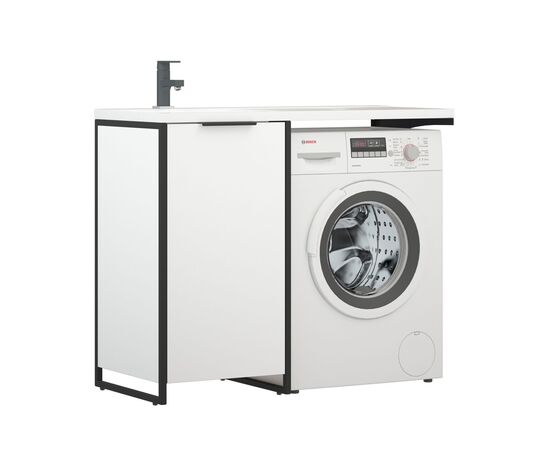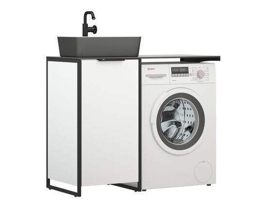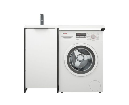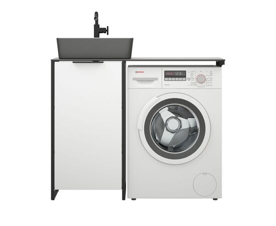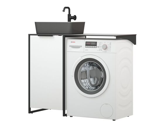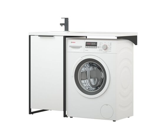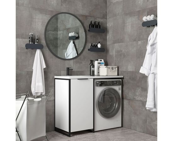 Модель "Гера" представляет собой тумбу на металлокаркасе и универсальный кронштейн, куда опирается столешница/раковина. В основе коллекции "Гера" металлический каркас, выполненный из профильной трубы размером 20*20 мм и окрашенный в черный цвет. Конструктивно может иметь как левостороннее расположение, так и правостороннее. В секции стиральной машины конструктивно предусмотрено расстояние между машинкой и столешницей/раковиной, что дает возможность отрегулировать Вашу стиральную машину по высоте, с учетом особенностей Ваших полов. Сам корпус тумбы также можно регулировать по высоте. В стандартную комплектацию входит: сама тумба на металлокаркасе, кронштейн и столешница ЛДСП. В закрытой распашным фасадом секции находятся 2 полки, с регулировкой по высоте. Бесшумность и длительный цикл эксплуатации обеспечивают петли с доводчиком. Секция под стиральную машину имеет стандартную для данной модели ширину 610 мм. Внутреннее пространство за распашными фасадами составляет 430 мм соответственно для модели размером 1100 мм. Отдельно может комплектоваться раковиной из литьевого мрамора, либо столешницей с накладной раковиной. В белом варианте фасады изготовлены с матовым покрытием PVC, тактильно создавая ощущение бархатистой поверхности.