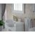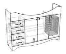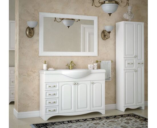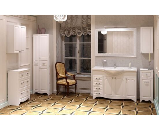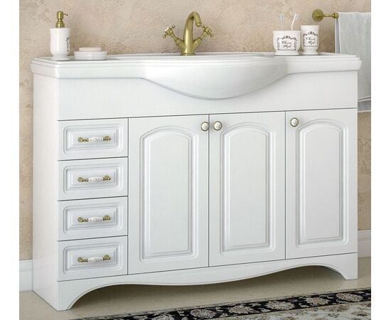 Тумба оснащена четырьмя выдвижными ящиками слева, две дверцы посередине, позади полка, справа - корзина для белья. Фасады - с фрезеровкой.