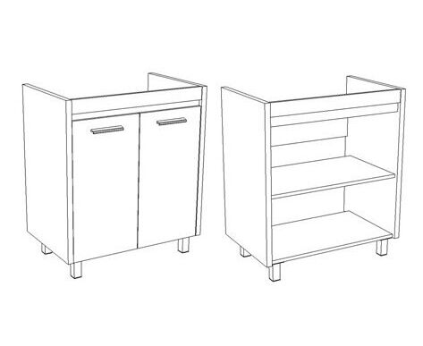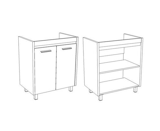 У тумбы 2 распашные двери, позади полки. 4 металлические опоры. Боковины выполнены из ЛДСП 26 мм толщиной.