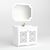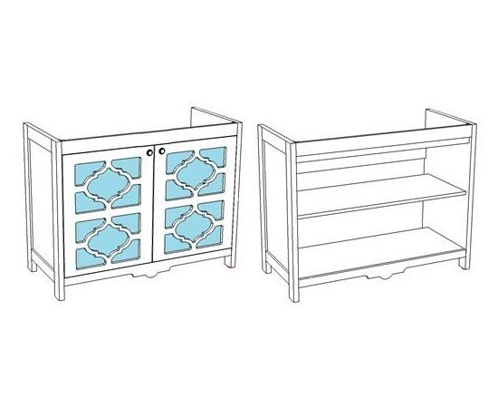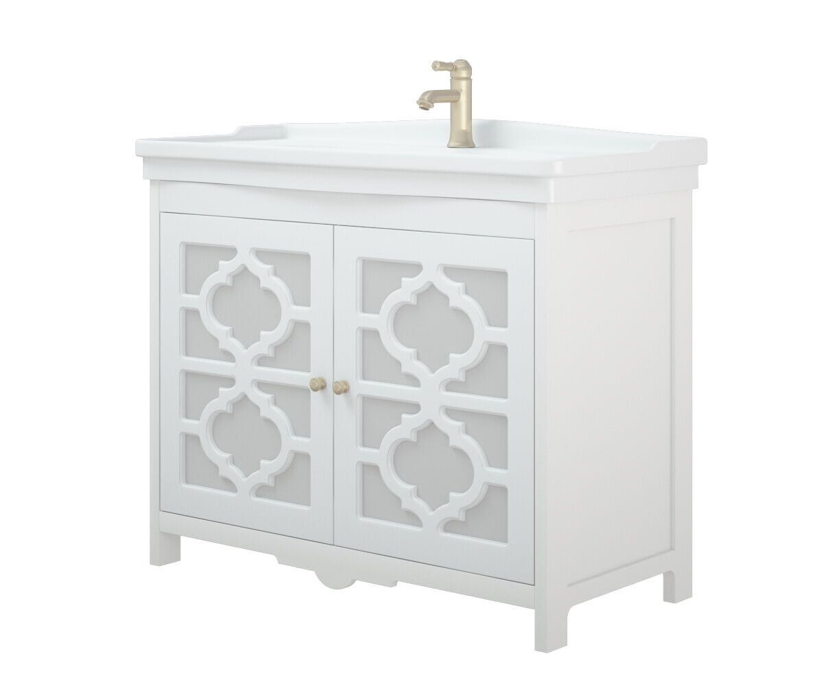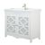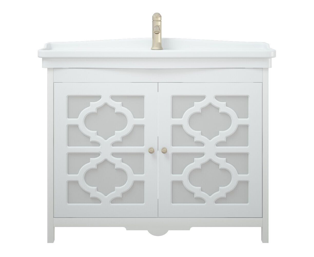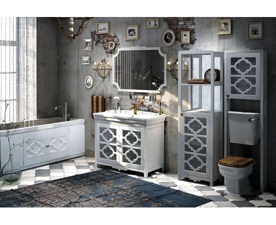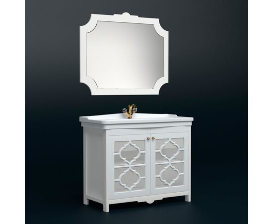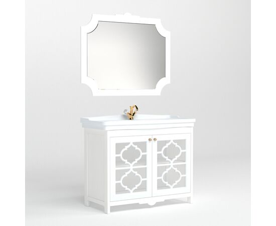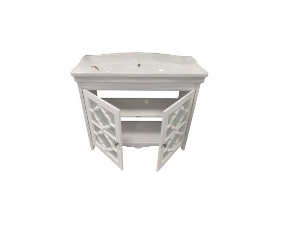 Комплексное решение для роскошных ванных комнат. У тумбы 2 распашные двери с фрезеровкой, позади фрезеровки - стекло. За дверьми полка. Вся тумба покрашена в матовую белую эмаль.