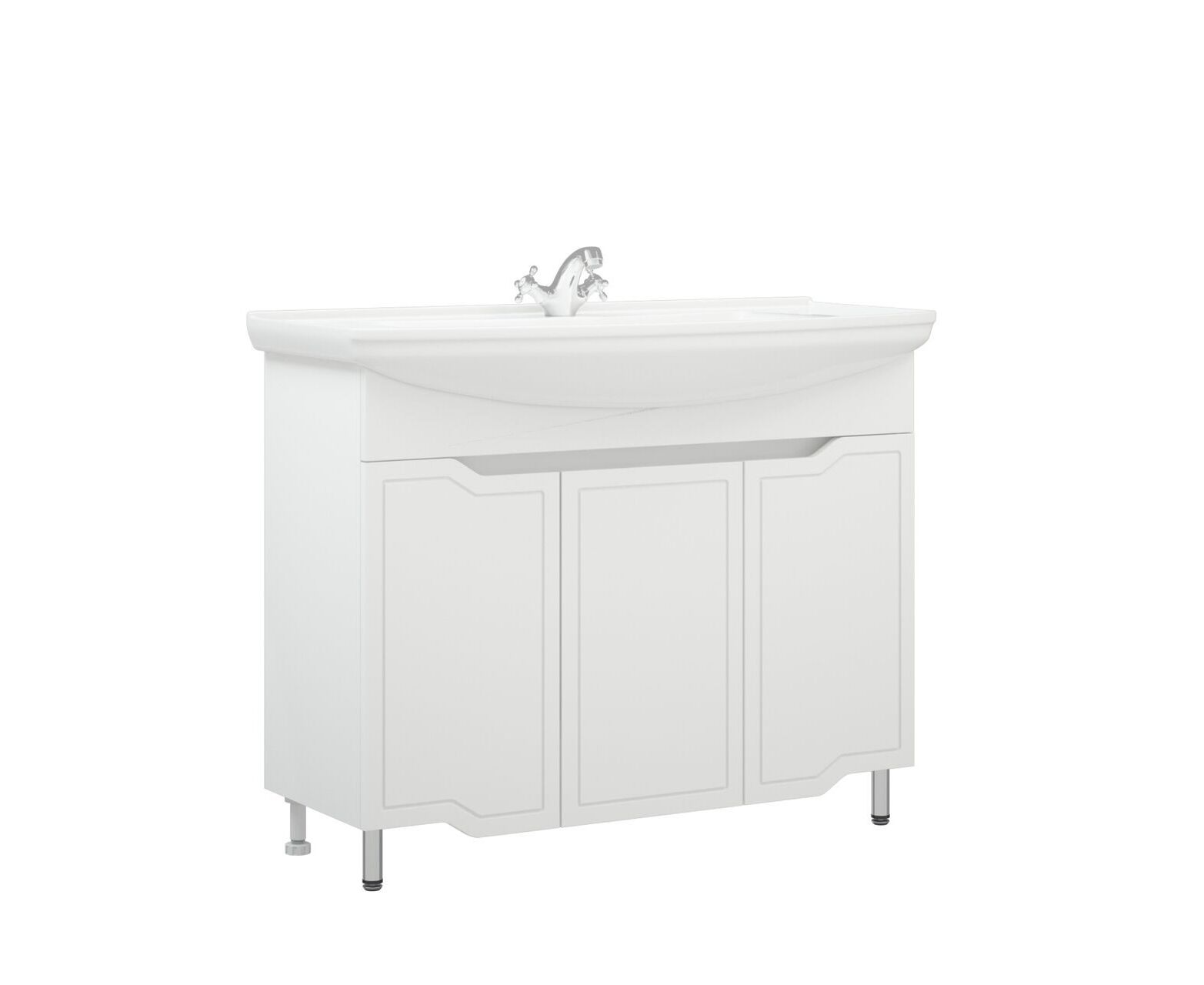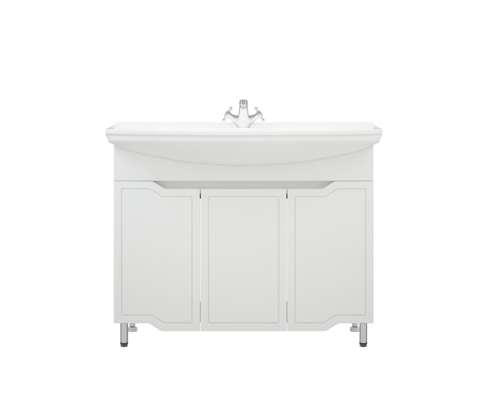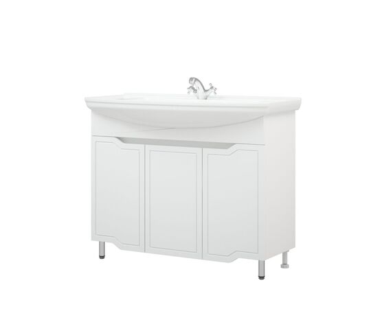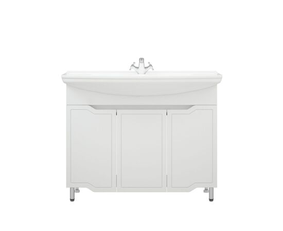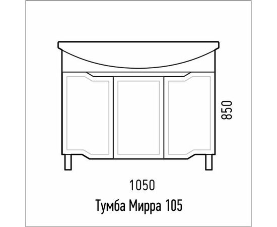 У тумбы «Мирра» 3 распашные дверки, позади дверок - полки. Фасады без ручек - вместо них, эргономичная форма - для удобства открывания. Фасад выполнен из влагостойкой плиты МДФ. В комплект входят хромированные опоры.