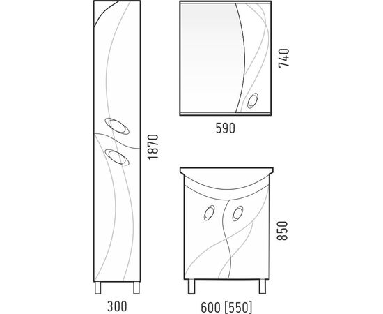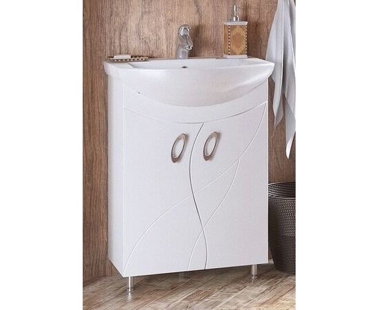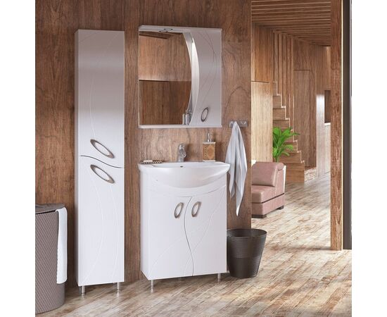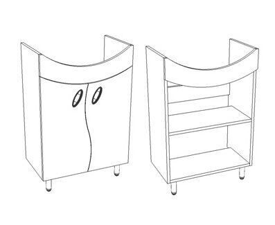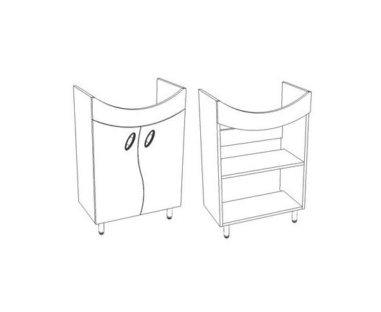 Тумба оснащена двумя распашными дверцами и полочкой посередине. Петли на дверях с доводчиками. У тумбы 3 опоры: 2 металлические, 1 пластиковая. Коромысло и двери - МДФ в плёнке белой, корпус - ЛДСП.