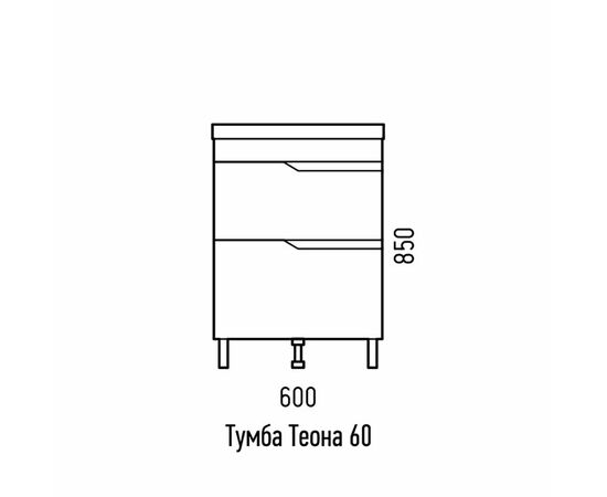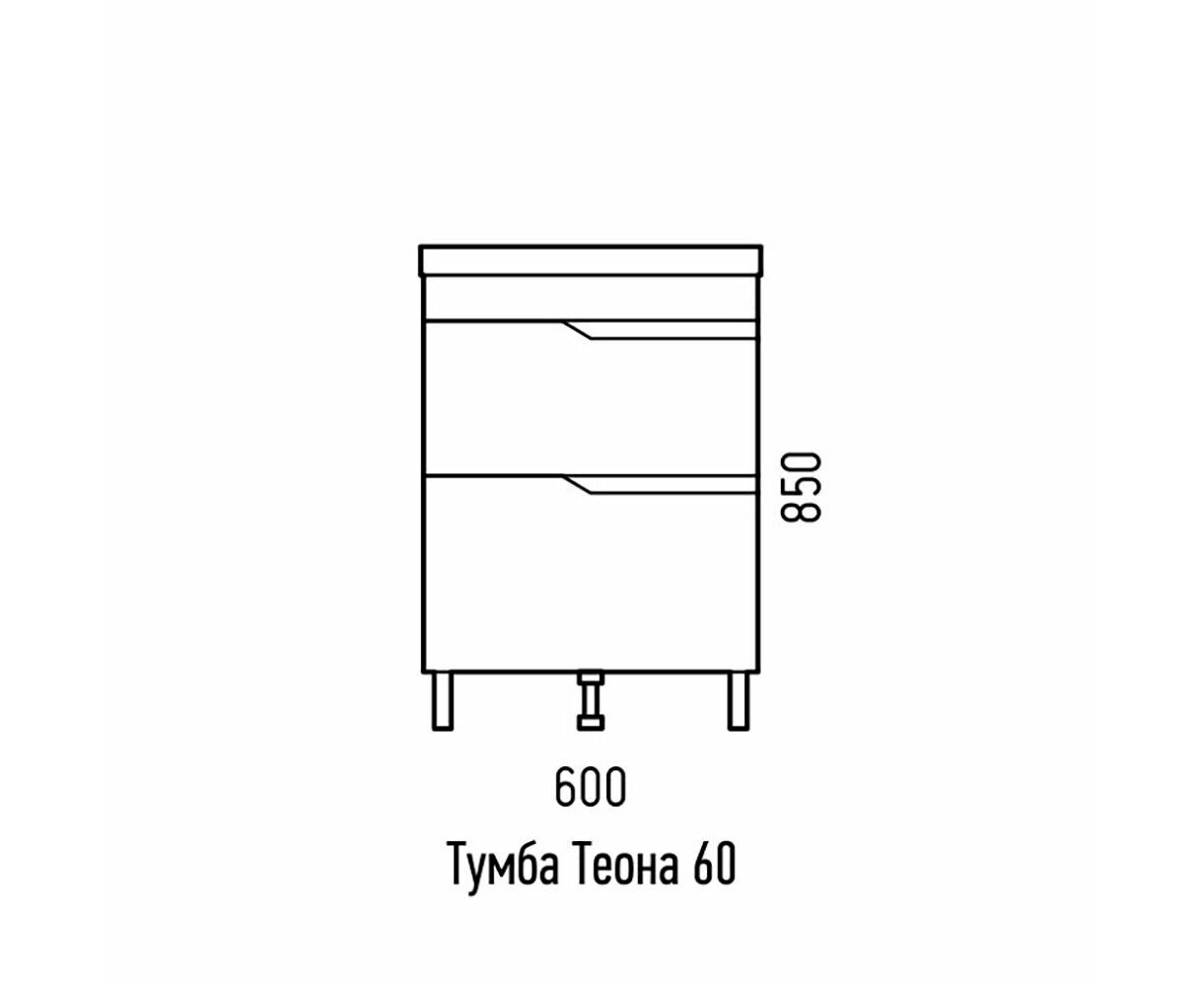 У мебели коллекции «Теона» корпус выполнен из ЛДСП, фасады - из влагостойкой плиты МДФ, покрытие - пленка ПВХ. Мебель оснащена элегантными интегрированными ручками. Может отдельно комплектоваться столешницами Сланец 60 и Керамогранит 60. Ящики на шариковых направляющих без доводчиков.