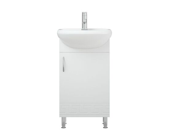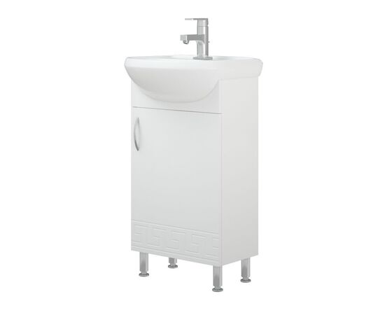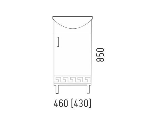 Тумба оснащена распашной дверцей и полочкой за ней. У тумбы 2 металлические опоры спереди, и сзади 1 пластиковая. Дверь и коромысло - МДФ в плёнке ПВХ. Корпус ЛДСП.