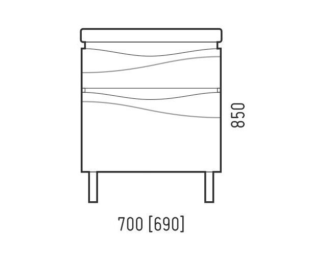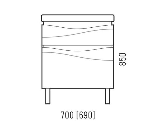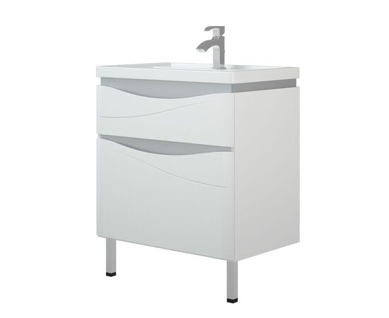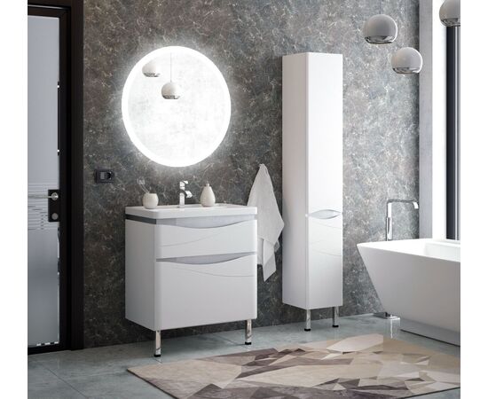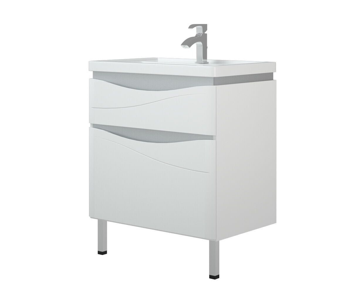 Тумба "Омаха" оснащена 2 выдвижными ящиками на направляющих скрытого монтажа с доводчиками. Верхний ящик высотой 80 мм с выпилом под коммуникации, нижний ящик высотой 120 мм. Фасады не имеют выпуклых ручек, конструктив тумбы позволяет удобно открывать фасады непосредственно руками. У тумбы 4 металлические опоры. Фасады и боковины окрашены глянцевой белой эмалью. Между фасадами и над верхним фасадом присутстуют декоративные планки из МДФ с пленкой "Серый металлик".