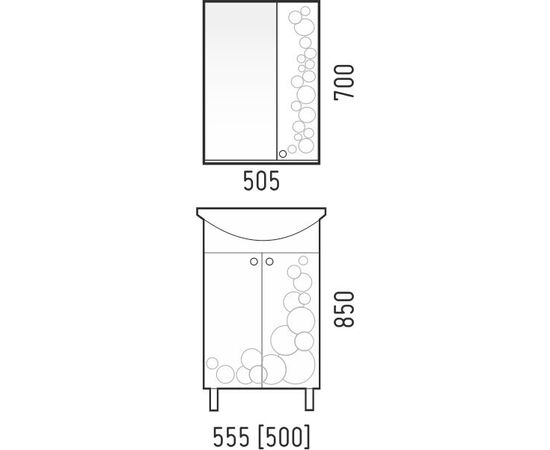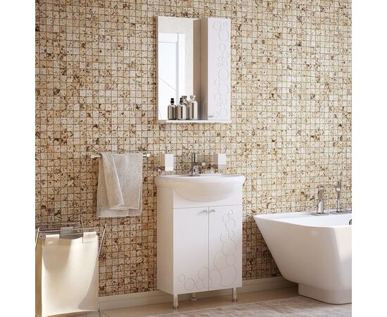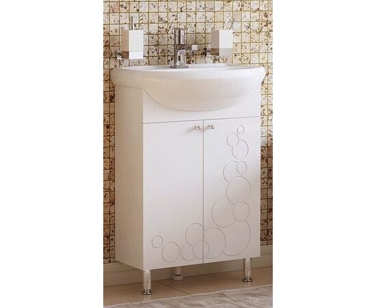 Тумба оснащена двумя распашными дверцами и одной полочкой за ними. У тумбы 2 металлические опоры спереди, сзади - 1 пластиковая. Двери и коромысло - МДФ в плёнке. Корпус ЛДСП. Фрезеровка в виде пузырьков.