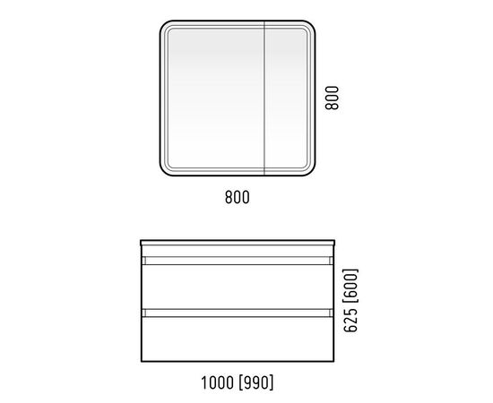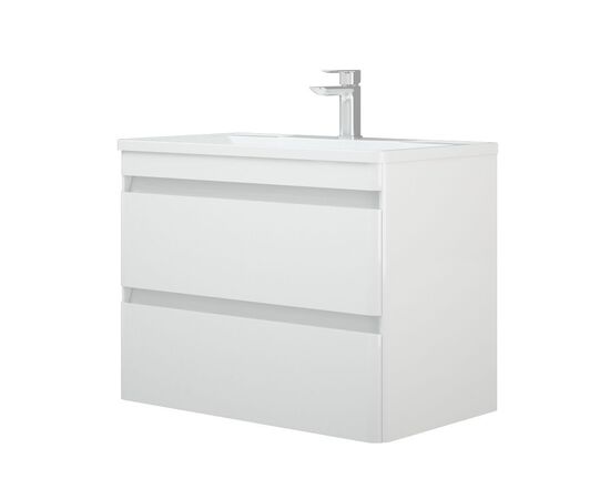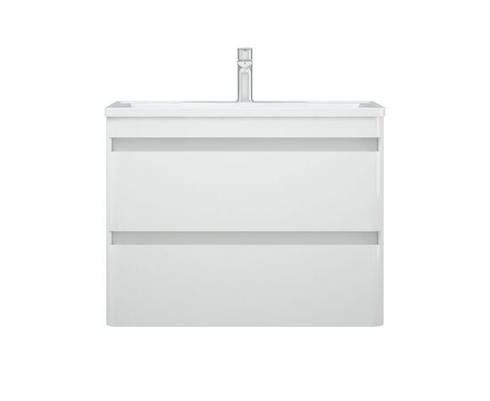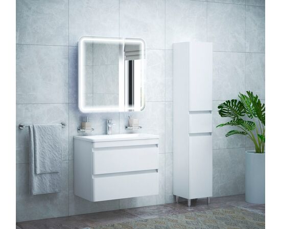 Подвесная тумба имеет интересный эргономичный дизайн - скругление боковин плавно переходит в скругления на фасадах. У тумбы 2 выдвижных ящика на направляющих скрытого монтажа с доводчиками. Нижний ящик цельный, верхний разделен на 2 отделения, с местом под коммуникации посередине. Верхний ящик высотой 100 мм с выпилом под коммуникации, нижний высотой 170 мм. Коромысло, боковины, фасады - МДФ в плёнке. Фасады не имеют ручек, конструктив тумбы позволяет открывать фасады без использования ручек.