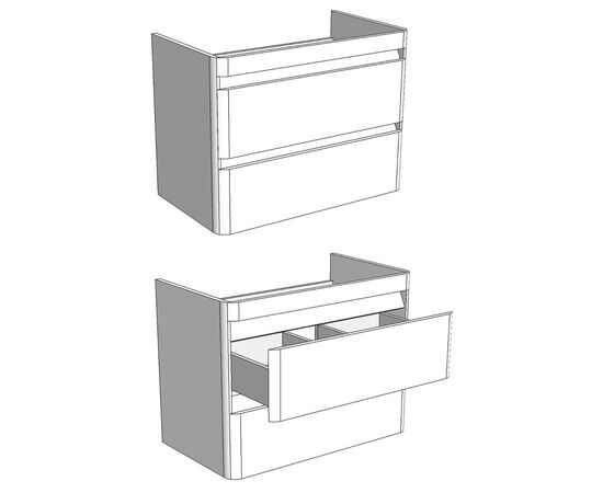 Подвесная тумба имеет интересный эргономичный дизайн - скругление боковин плавно переходит в скругления на фасадах. У тумбы 2 выдвижных ящика на направляющих скрытого монтажа с доводчиками. Нижний ящик цельный, верхний разделен на 2 отделения, с местом под коммуникации посередине. Верхний ящик высотой 100 мм с выпилом под коммуникации, нижний высотой 170 мм. Коромысло, боковины, фасады - МДФ в плёнке. Фасады не имеют ручек, конструктив тумбы позволяет открывать фасады без использования ручек.
