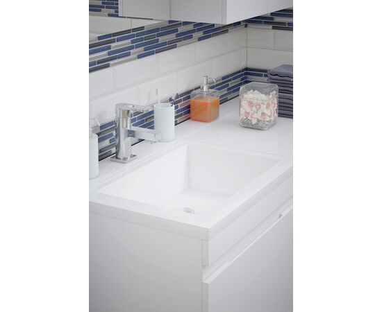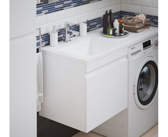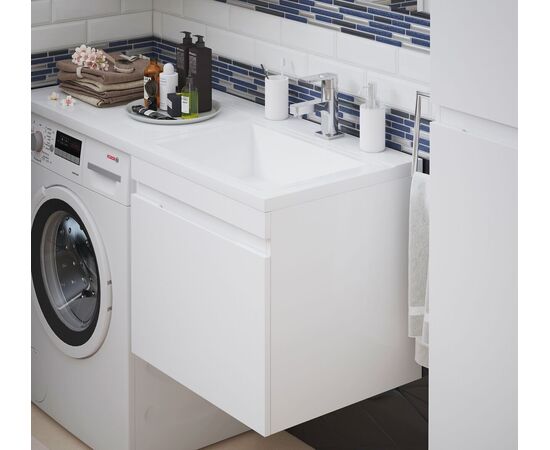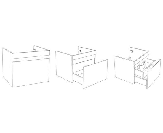 Тумба оснащена двумя выдвижными ящиками. Первый ящик имеет большой внешний фасад без ручки, так как есть специально сделанная фрезеровка для открывания. Ящик высотой 70 мм, оснащен направляющими скрытого монтажа с доводчиками. Второй ящик можно открыть только тогда, когда открыт большой ящик. Второй ящик оснащен направляющими типа "push-to-open", что означает следующее - фасад открывается при нажатии. Направляющие второго ящика - с доводчиками. Ящик высотой 70 мм. Оснащен выпилом под коммуникации. Тумба к стене крепится с помощью подвесов "Scarpi", которые входят в комплект. Фасадная часть и боковины - в эмали.