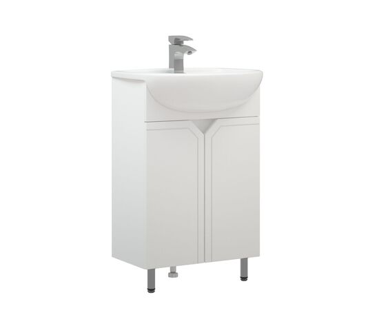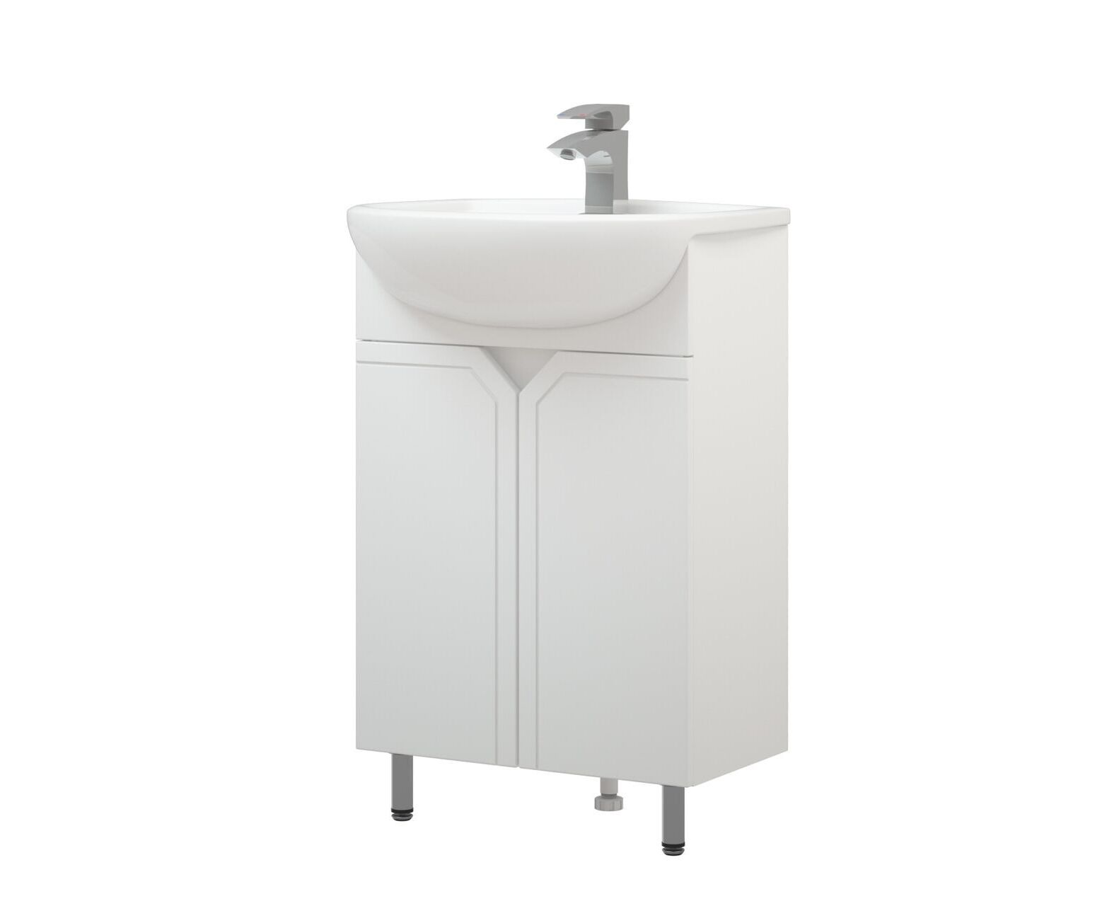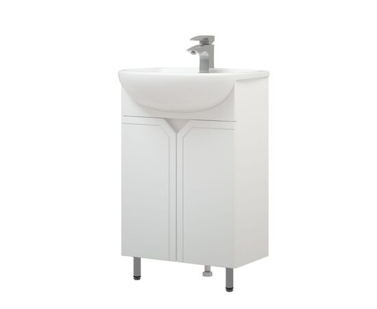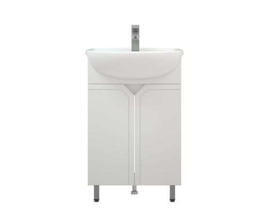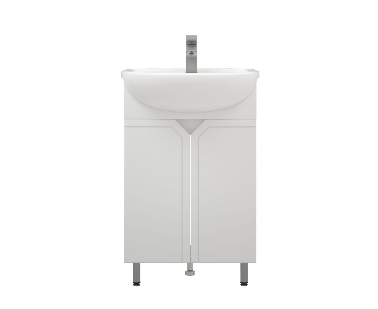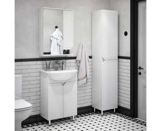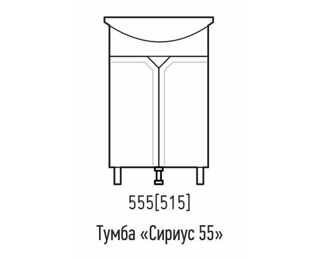У тумбы «Сириус» - современный и лаконичный дизайн, который подойдет практически для каждой ванной комнаты. 2 распашные дверки, позади дверок - полки. Каждая дверка на одной петле с доводчиком и на одной - простой. Фасады без ручек - вместо них эргономичный спил под 45 градусов и подчеркивающая его фрезеровка. Фасад выполнен из влагостойкой плиты МДФ, корпус - ЛДСП. В комплект входят две металлические опоры и одна пластиковая.