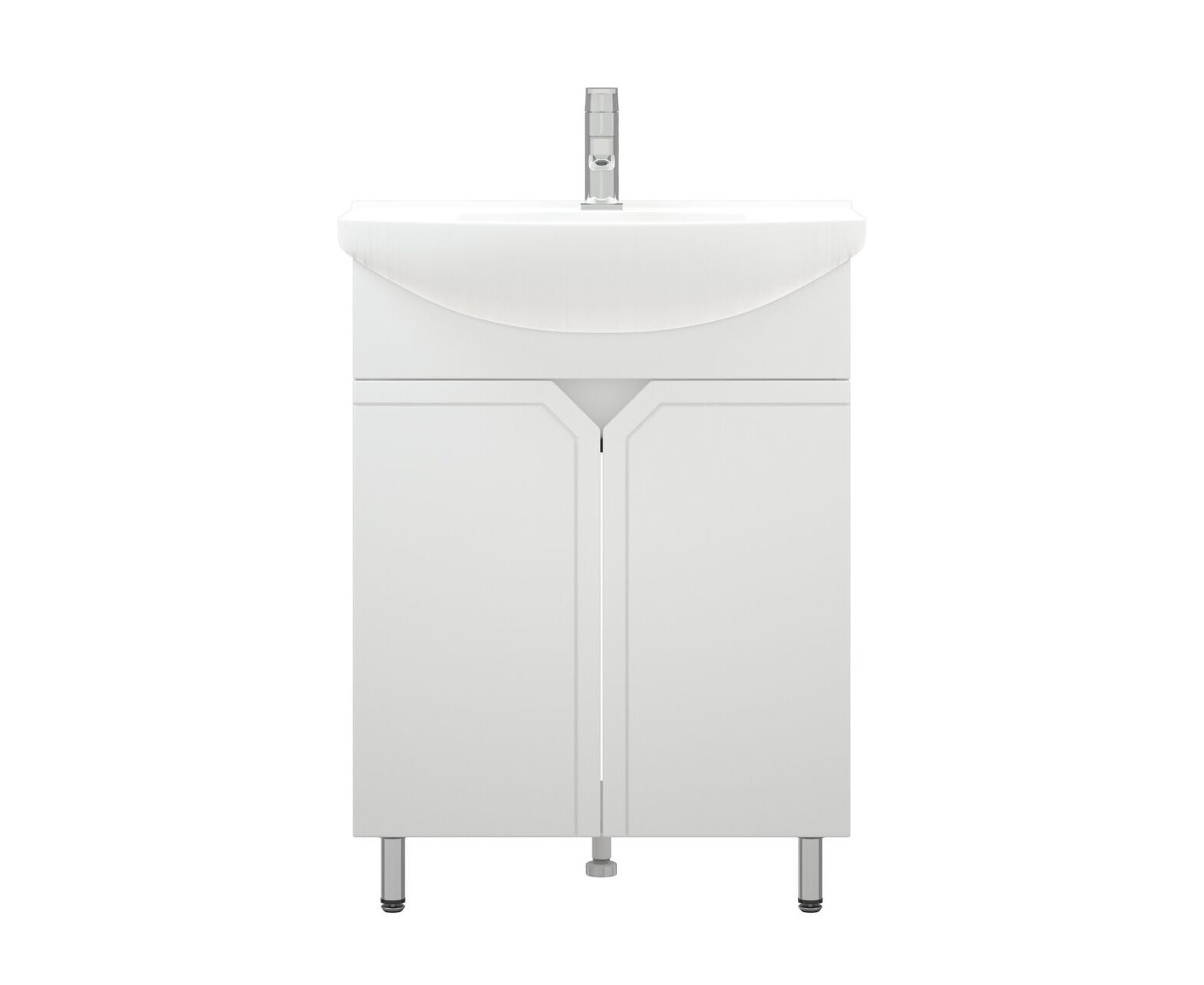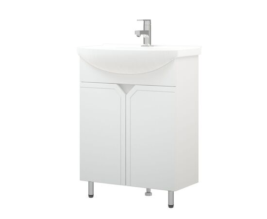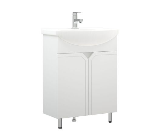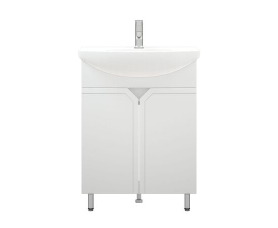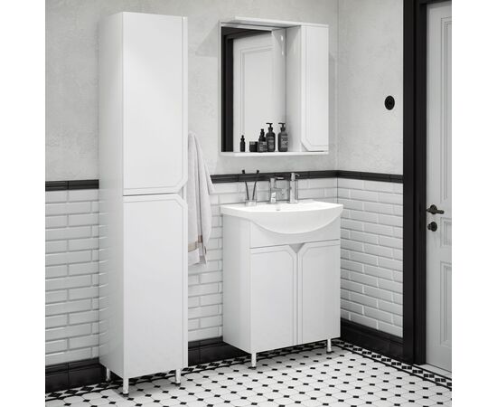 У тумбы «Сириус» - современный и лаконичный дизайн, который подойдет практически для каждой ванной комнаты. 2 распашные дверки, позади дверок - полки. Каждая дверка на одной петле с доводчиком и на одной - простой. Фасады без ручек - вместо них эргономичный спил под 45 градусов и подчеркивающая его фрезеровка. Фасад выполнен из влагостойкой плиты МДФ, корпус - ЛДСП. В комплект входят две металлические опоры и одна пластиковая.